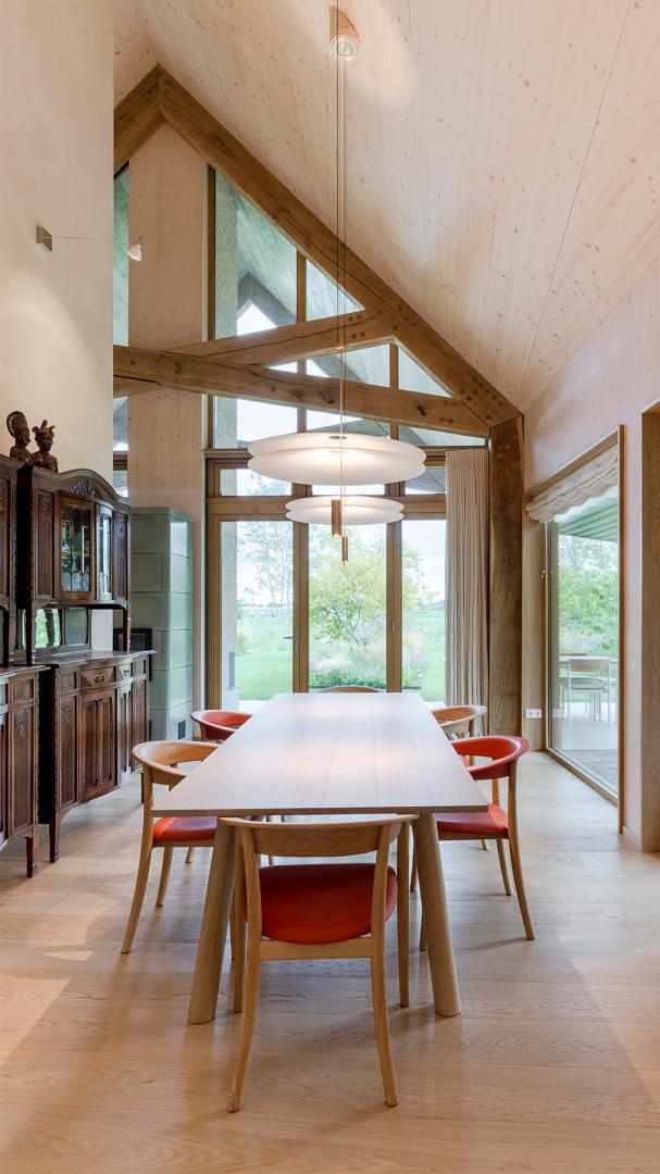 The shape of the house is an archetypal Dutch farmhouse, of which the height and width is lessened at the rear, allowing three stories in the front part of the house (bedrooms, study and attic) and one in the rear (living and dining). In order to bring more light into the middle of the living spaces the roof is cut and shifted outwards, breaking the volume of the roof into smaller pieces. The kitchen is pulled out into the garden, splitting a wraparound veranda. The layout of the home is flexible: it’s possible to live solely on the ground floor in retirement, to split the house to make a separate granny flat, or even separate the combined plots and develop another house on the adjacent land in the future. Energy is provided by a ground source heat pump and the solar array on the veranda. We choose to prefabricate the complex structure out of sustainable cross laminated timber. Lined with wood fibre insulation the building is fully vapour permeable, providing exemplary indoor air quality without the need for mechanical systems. Developed together with experts the thatch roof build up is the first of its kind in the world. A thick interior earth brick wall, running down the spine of the house serves as a radiant heating/cooling element, as well as to control the humidity levels indoors. The clay plaster and wood finishes provide the best indoor air quality possible. Specific care was taken to source all materials as locally as possible; none came from outside Europe. The geometry of the building creates surprising and varied spaces as you move through the home. Creating unique qualities of space using traditional and local building materials connects the home and its occupants with local traditions and strengthens the development of a new building craft in the area. Locals had never seen a home built with a mass timber structure before as blockwork remains the standard.