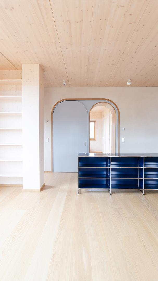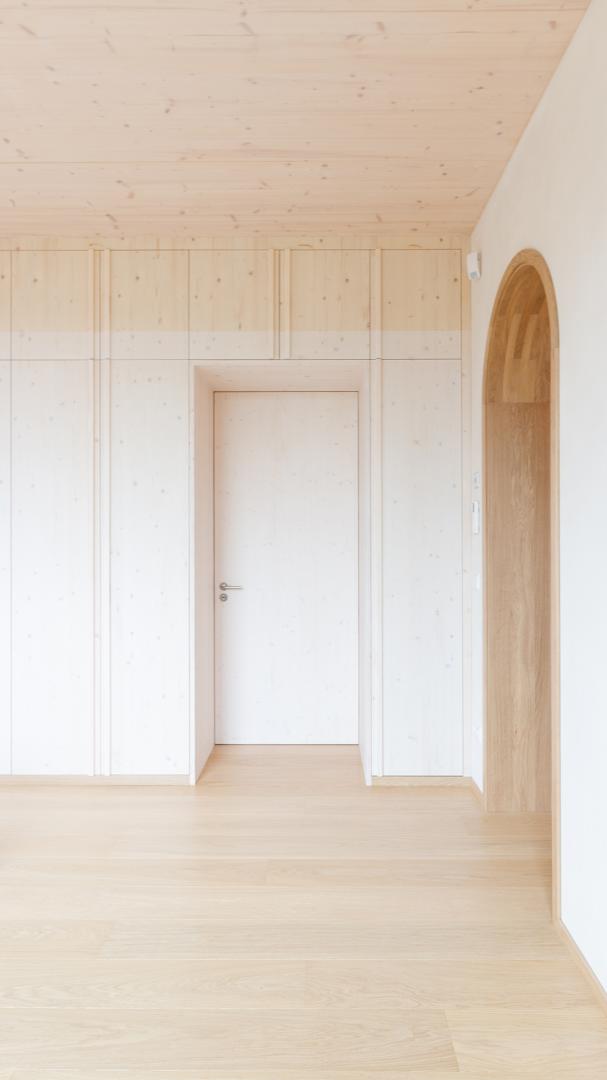 The interiors of the Veldhuis use a subtle color palette: natural white clay plaster walls and whitewashed CLT contrast with the oak floors and window frames. The geometry of the building creates surprising and varied spaces as you move through the home.