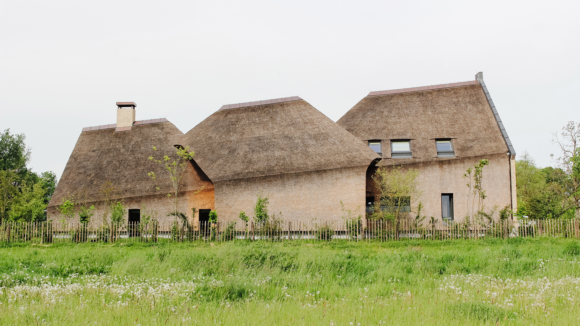 The east façade of the Veldhuis is fully lined with thatch, sourced locally in the Netherlands (rather than imported from abroad). From this view the lessening of the height from front to back is highlighted, as is the breaking of the mass into three distinct sections.