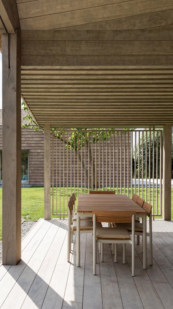 The rear façade of the Veldhuis is fully glazed. A veranda provides an overhang to shade the living spaces from the harsh summer sun, while letting the lower winter sun penetrate to warm up the thick earth brick wall in the center of the room. The earth brick wall serves two purposes – embedded heating and cooling elements allow it to serve as radiant temperature control, and it also helps regulate humidity, which is important in a wood structure.