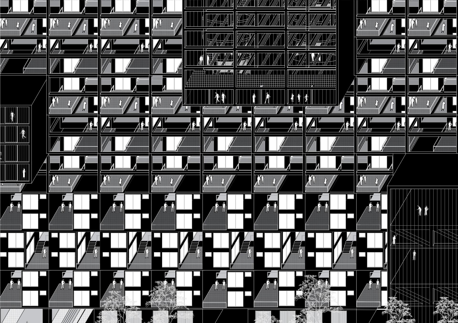Our desire was to create a multifunctional structure that would adapt its contents to the location. Our wish is that the structure can function anywhere in the world. The contents are adapted to the location and needs of the city. The construction is solid and simple and enables the building to be easily repurposed.The building functions as a city, Corridors become promenades and streets, the apartment becomes a house and each zone is accompanied by rural elements (orchards, parks).
