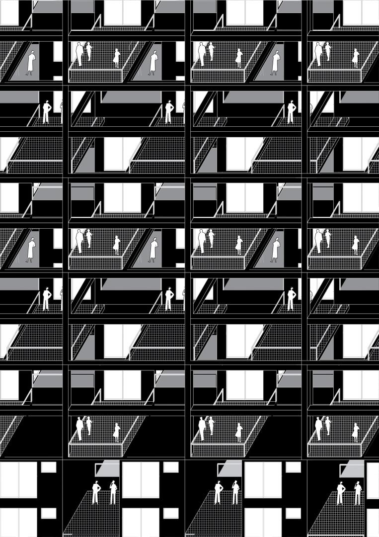 Before moving in, the buyer chooses the type of apartment and can change it at his will within the very flexible structure of the apartment.Zones with facilities such as a recreation zone pop out from the facade and thus enliven the industrial part of the city of Zagreb. They give a sense of living. I walk down the avenue and see a park 40 meters above me where children are running, I hear the sounds of jumping into the pool, I observe life on the terraces, a neighbor's barbecue, a grandmother planting lemons, I hear the sound of children and life in a vertical city.