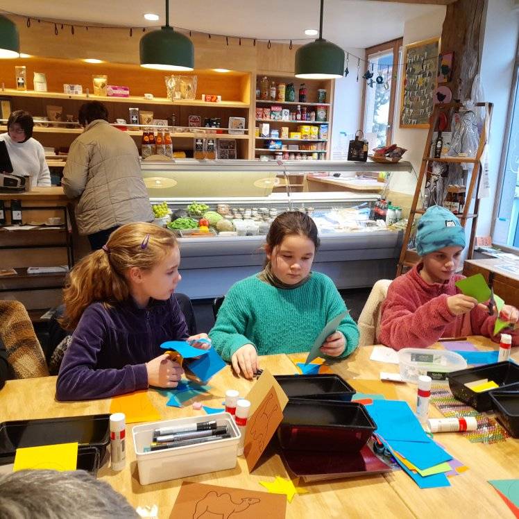When setting up the Village Points, for ecological and budgetary reasons, we thought as much as possible about reusing materials and how to optimise as much as possible with limited resources. We think circularly by appealing to residents for donations (a wheelbarrow, cooking pans, racks and cupboards for the shop). Each Village Point was decorated with great care and warmth. There is space to have a coffee in a cosy setting, the shop offers enough space for shopping.