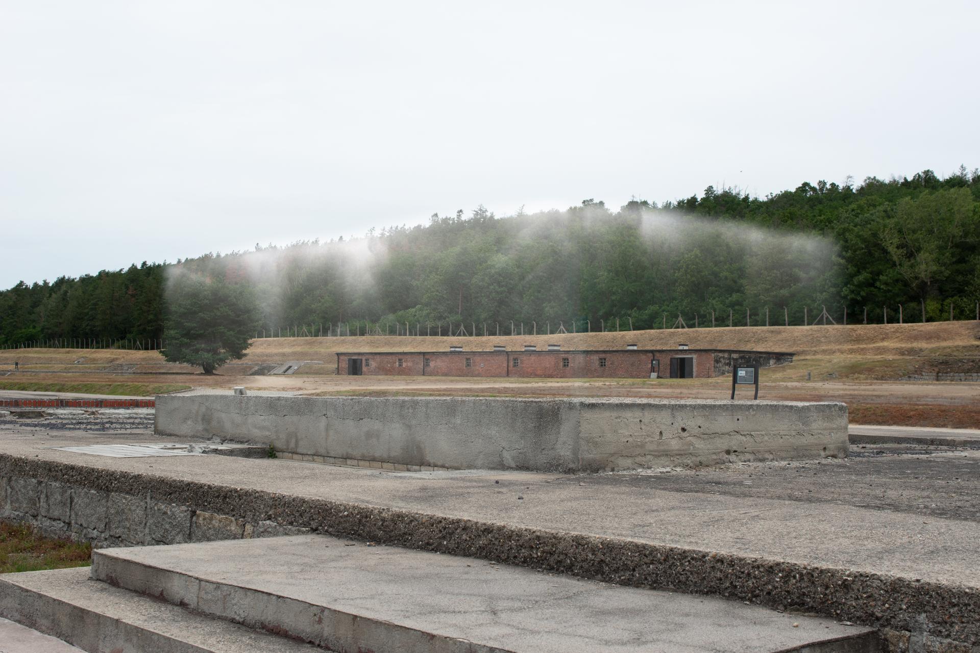 In the project, fine mist hovers over the foundations of the former buildings of the Gross-Rosen concentration camp, sometimes fainter, sometimes more clearly visible. Double exposures of models on photos of the remains are used to mark the areas of the different premises of the camp and reconstruct the cubatures of the prison rooms.