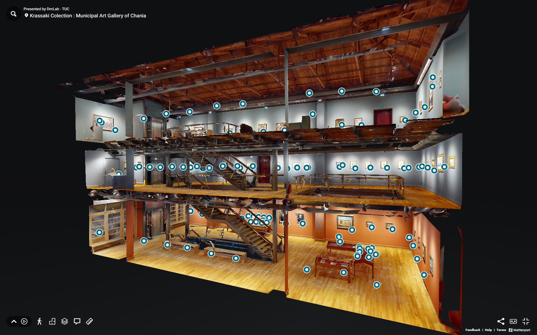The overall mission took place from June to October 2022. Firstly, the research group proceeded in 3D-scanning of the Municipal Gallery of Chania with the use of Matteport, which led to the creation of a 3Dmodel of the physical space in .obj. The model is a digital clone that was used as base for all members to work on. Also, the largest part of the exhibits was scanned and cataloged, thus creating a digital archive.Opened in Tilt Brush, the team could study, build the exhibition, decide the aesthetic approach, and then upload inside this model the digital clone of the artworks. Following this setup, the curator of the physical exhibition was able to decide on details-coloring, the exhibition concept of each floor-before the actual physical interventions. When the interior of the Gallery was finalized to host the exhibition, the empty but colored space of the Gallery was 3D scanned again. Through the updated 3D model, the curator finalized the position of each exhibit and the graphic designers, in turn, decided on details for their descriptions. In parallel, the team created a VR experience as an educational tool. The system was installed on-site. After the physical visit to the Gallery and the familiarization with the exhibits, the user can revisit it in a virtual space and compose his own virtual exhibition.Through the VR-Xebit, the user is able to walk through the virtual building, change the exhibit's position, scale them, ‘touch’ them, and better appreciate their color, shape, and value. At the end, the user can take pictures; video, or gif, into the Virtual environment; in order to save his setup. After the final setup, the team scanned the place anew. Lastly, the 3D scan after the installation of the exhibition was done in order to digitize the entire exhibition, thus offering a remote visit, by using only the link from the official website of the Art Gallery. All stored information on the history and description of the exhibit are available by selecting it.