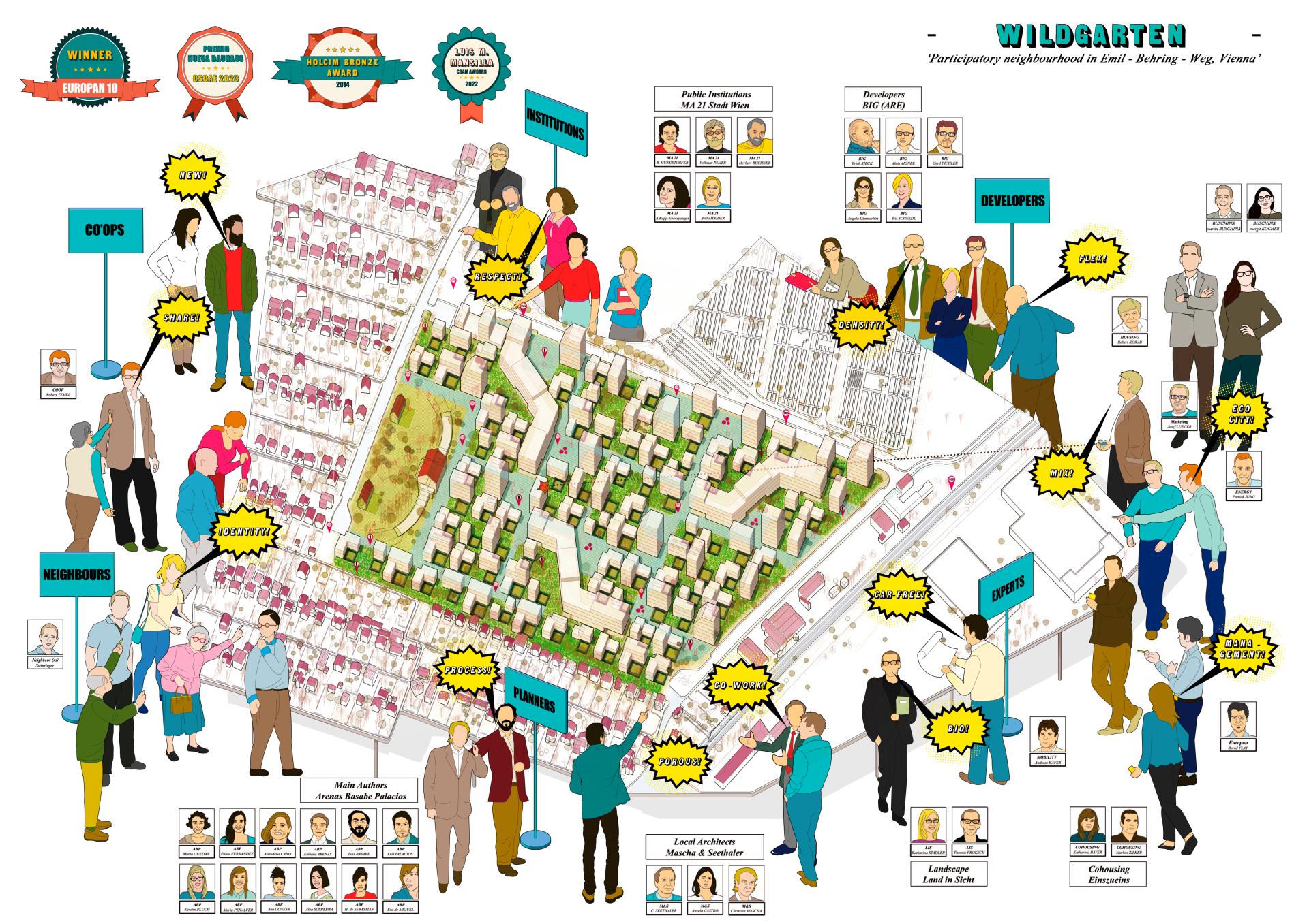 The 'Wildgarten' urban project is a built manifesto of multi-stakeholder inclusion in the production of the city, making its design a more democratic process. The collaborative planning process includes all these stakeholders at a negotiation table: EUROPAN EUROPE and specifically EUROPAN AUSTRIA as organizer (director: Bernd Vlay); the public office MA21 as representative of the City of Vienna; AUSTRIAN REAL ESTATE GmbH (BIG-ARE) as land developer; representatives of CO-HOUSING in Vienna (Robert Temel); citizen representatives of the neighbours or future inhabitants; Mascha & Seethaler GmbH as local partners of Arenas Basabe Palacios architects S. L., who together have guided the process supported by a multidisciplinary team of technicians. All stakeholders have had a decisive role in the planning process, involved in the process through monthly participation workshops, where they contributed with their own interests, needs and demands.