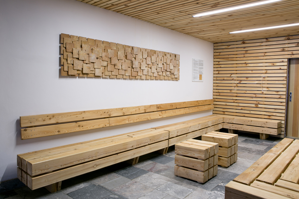 Interior of waiting area at the oncological institute is accomplished with art object on the wall that is an intersection of art, storytelling and science whereas there were used the wooden wastes from production of benches with dendrochronological analyses used for comparison of story of the used tree with life of patients.