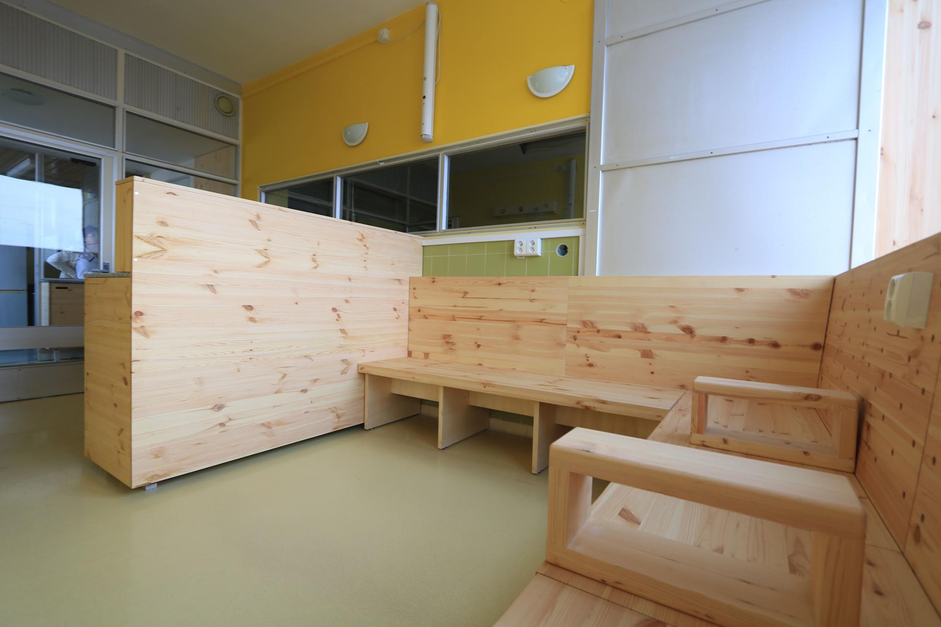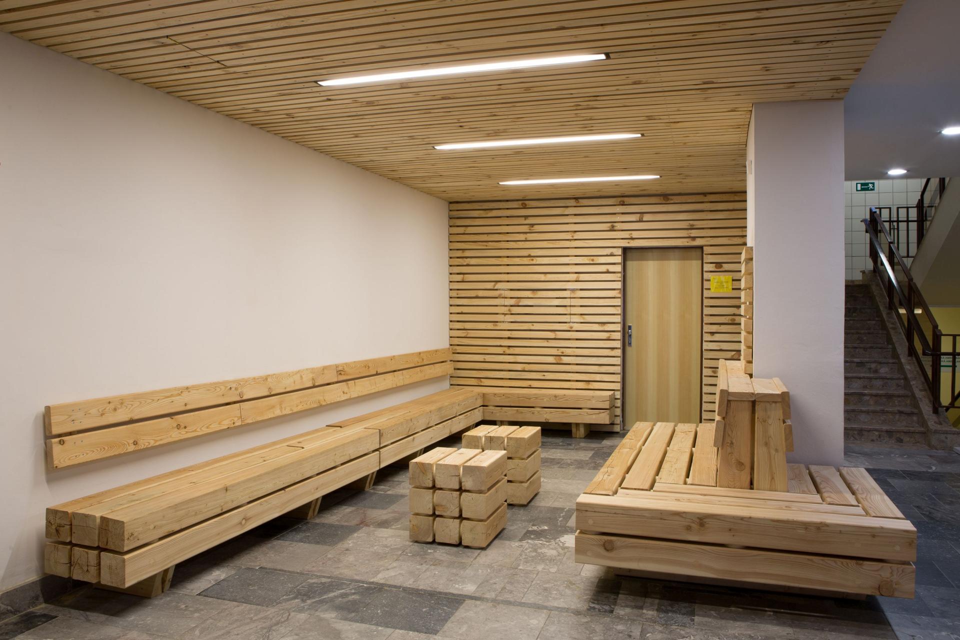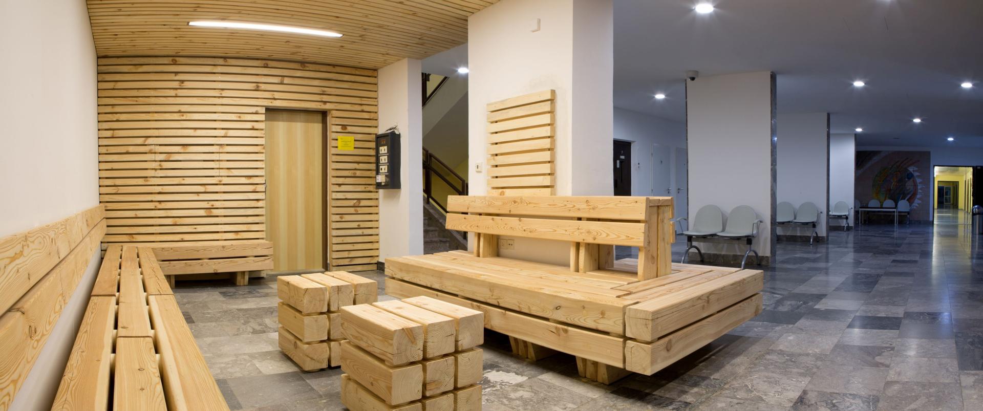 Project's main goal is to bring examples of using wood as a sustainable material with many well-being and restorative benefits in a demanding environment. The first intervention was the reconstruction of the waiting area at the foyer of the pavilion of palliative care of the National Oncological Institute in Bratislava, where was implemented larch and pine wood without finishing on benches and wall panelling.