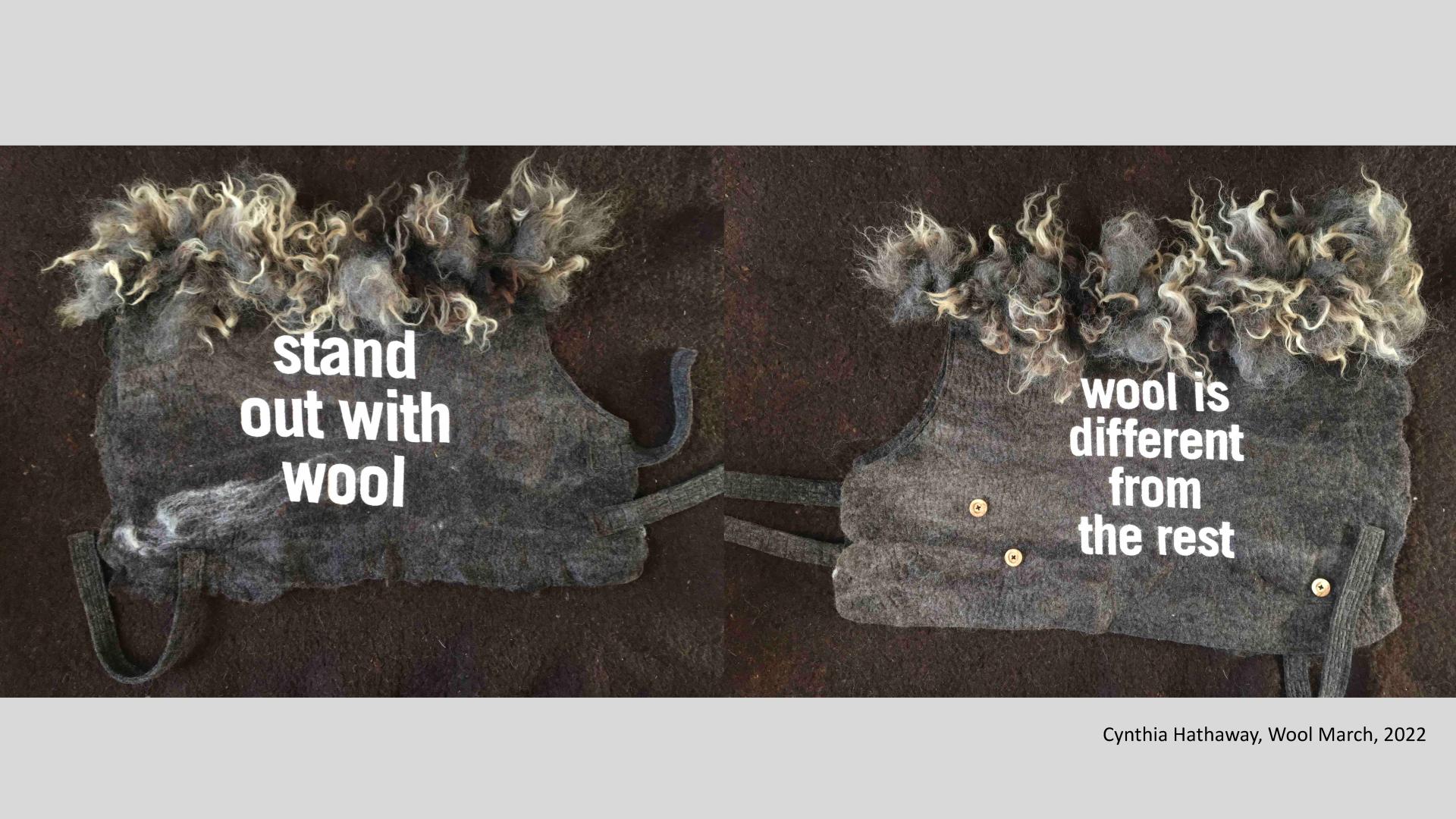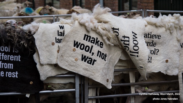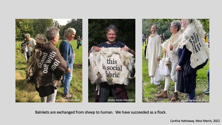 I developed a social and participatory design and methodology through artistic connective practices. As a designer, I create products to reflect and support community action and concerns, platformed on 20 wool blankets with embroidered sayings (40 in total) on each side. The blankets were visually attractive, and communicated many messages from a variety of people about wool, being together, supporting systems of social and environmental sustainability. The complex nature of the project, (to create more public public spaces, bring urban and rural knowledges together, create a multicultural experience, impact and production, change a city, bring animal and human relations in balance, share sustainable practices such as transhumance) I created an an open door makers space and final event. The Wool March was a design and designed. Inspired by parades, where many floats or platforms are made to show expertise, The Wool March adapted a form people already knew. This creates easy access, read-ability, and draws an audience. The shepherd, sheep and walkers were given a stage, so to speak, and a context of a city and its streets. The open door wool studio is a set up connecting the designer to the street in which the studio. Not tucked away in a building, but close to a city market where hundreds of people go twice a week, the wool studio is a part of the community, a place to drop in, connect to and through wool making to each other and to a variety of cultural pasts. It creates community. The designer facilitates community production, not for the benefit of one's self, but for the larger public. Ideas collected shape the project. The design is open ended, dependent on community involvement. As a designer, I am on a path to connect to and with the sources of one's material, and bring into the design the many producers along the chain. This includes animal, land, shepherd, but also those far away, such as wool recyclers in Pakistan. The Wool March is a local-global action.
