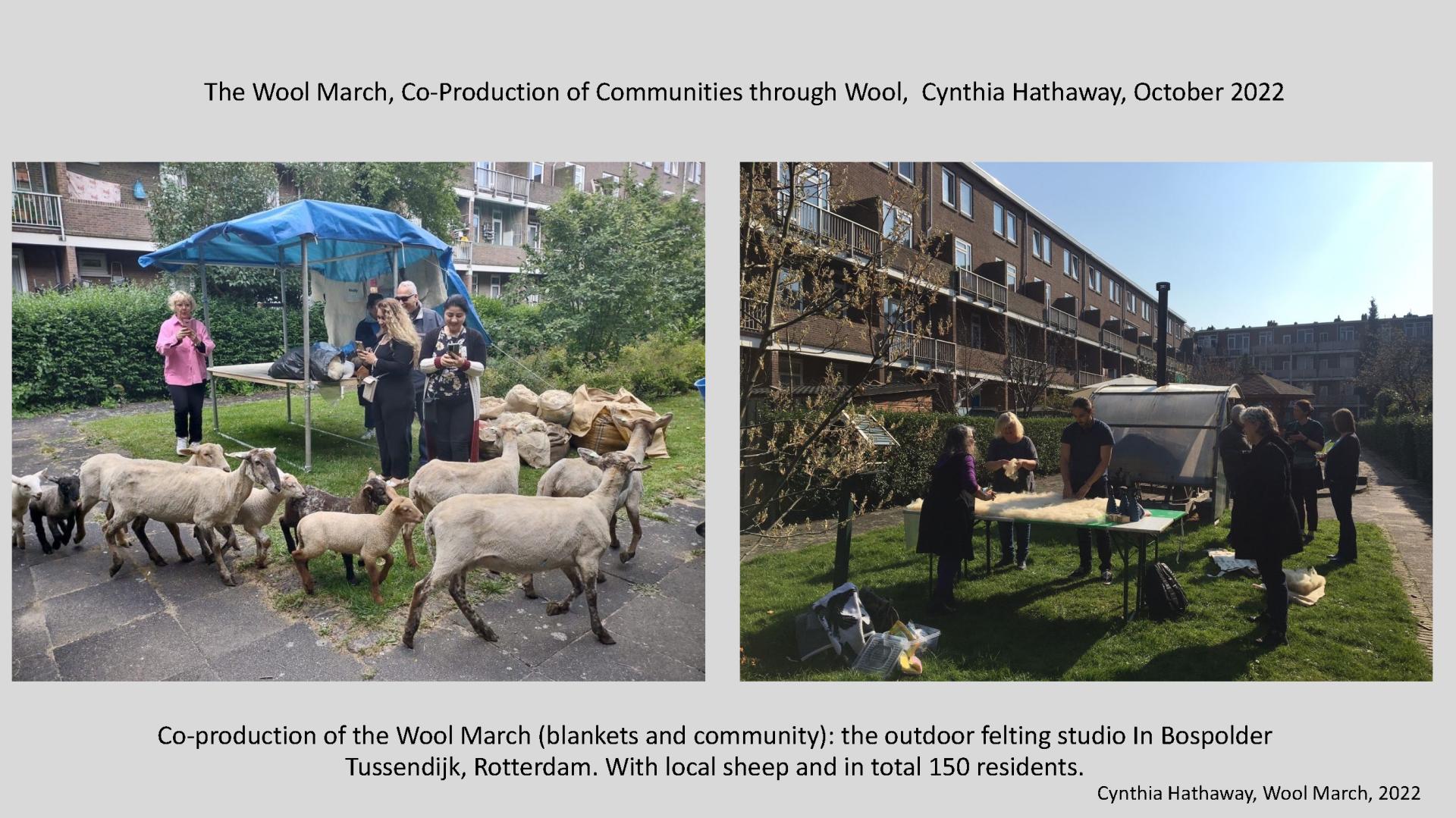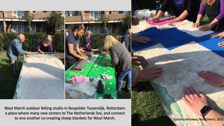 Before the Wool March, I had many months of setting up my felting studio in multicultural communities. For example, I was invited to set up my studio in a neighborhood in Rotterdam called the Bospolder Tussendijk, a community full of ideas and bottom up activities but often overlooked, or considered by government. Creating felting workshops in the outdoor public space, having an open door studio policy, being there every day for months, having huge bags of local wool visible, attracted people to come to me and share stories of wool. And through felting, a very accessible way to make things with wool, many people would come weekly to help make the sheep blankets. By making together, as with quilt making, stories come out. Not only about wool in their homeland and childhood, but also what is missing today, such as making things from scratch instead of buying everything, connecting to grandparents and their skills of making, the estrangement experienced in a new land such as The NL, and a desire to see themselves reflected in the making of their community.I heard stories from men and women, children and teenagers, and the elderly whilst we had our hands in the wool. Turkish and Moroccan women shared tips on how they felted, or washed wool in streams. Iranian men showed young Bulgarian men how to make a felting and washing station. Young children from many nationalities were thrilled to touch a real sheep when I brought some to the studio. They learned the wool made clothing, and was from a real animal. Wool is a social fabric. A key objective of the project is to transform siloed spaces into community gathering and places of co-production. I believe any community experiencing disenfranchisement, loneliness, disconnection, and/or the desire to share one's ideas and skills, it is through wool (making, touching, smelling, experiencing) and the Wool March (walking together with sheep, shepherd and each other in our surroundings) a feeling of citizenship is achievable.