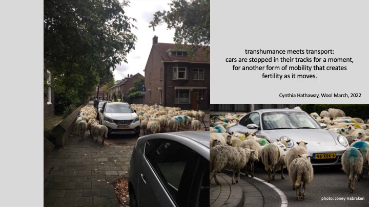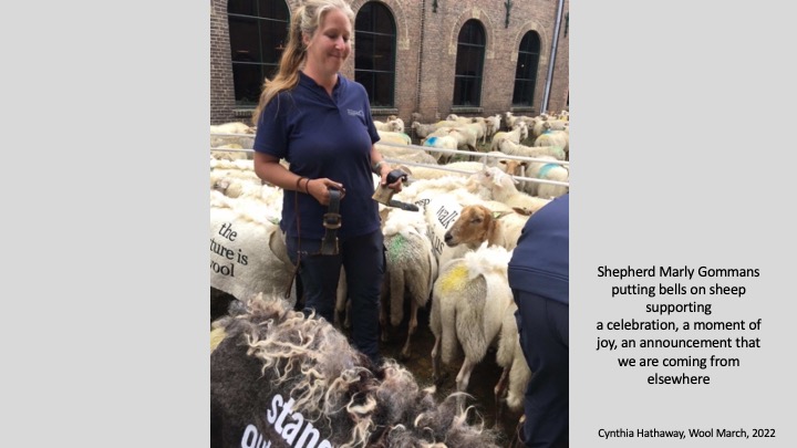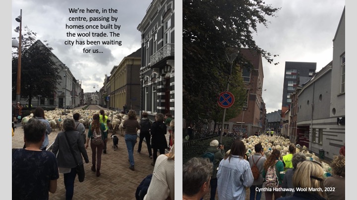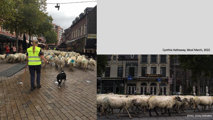 We often are led to believe we need big, expensive, and complex designs to bring people together, to create effect. We are becoming numbed as a society by too much stimulation, the extravaganza, most likely brought about by digital design. In many ways, we are pacified. We can sit back, and be fed by tiny devices to watch the world, rather than be part of it. The Wool March is an example of a very direct, uncomplicated and easy way to experience something very deeply, and be motivated to change something as a community. Knowing it is possible to join an existing system, that of transhumance, is a way to connect to land and animals as co-workers and producers, to a sustainable action, to a new way of experiencing our cities with low impact. The word innovative suggests something totally new, different, but I see the Wool March as bringing back ancient practice into the here and now. How it regains importance, is used in a different way, is made public by public, this is innovative. You only need your feet to join in (or bicycle or electric scooter). Walking with sheep through a city is innovative now, because it hasn't been done in The Netherlands for hundreds of years, in yet it was a typical practice for the region, and in other parts of Europe. Infact, transhumance is a global tradition of making pasture. Such a 'simple' action (there is some coordination involved but is it really ground work, with feet in community) has global connections and consequences. Having animals also 'march' brings their devaluation into the picture, as 95% of wool is considered waste material, usually incinerated, dumped or sent to China for pennies a kilo.