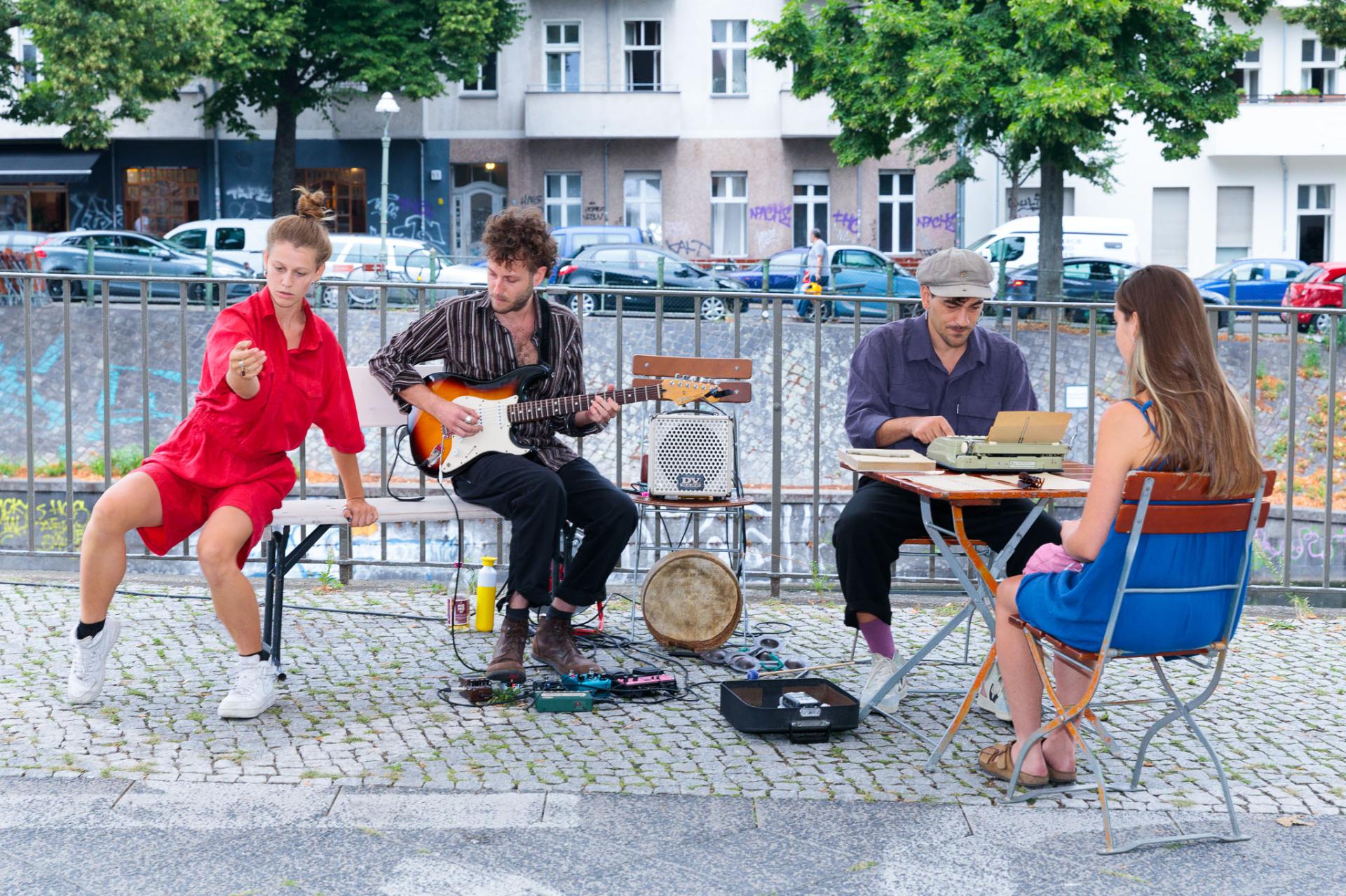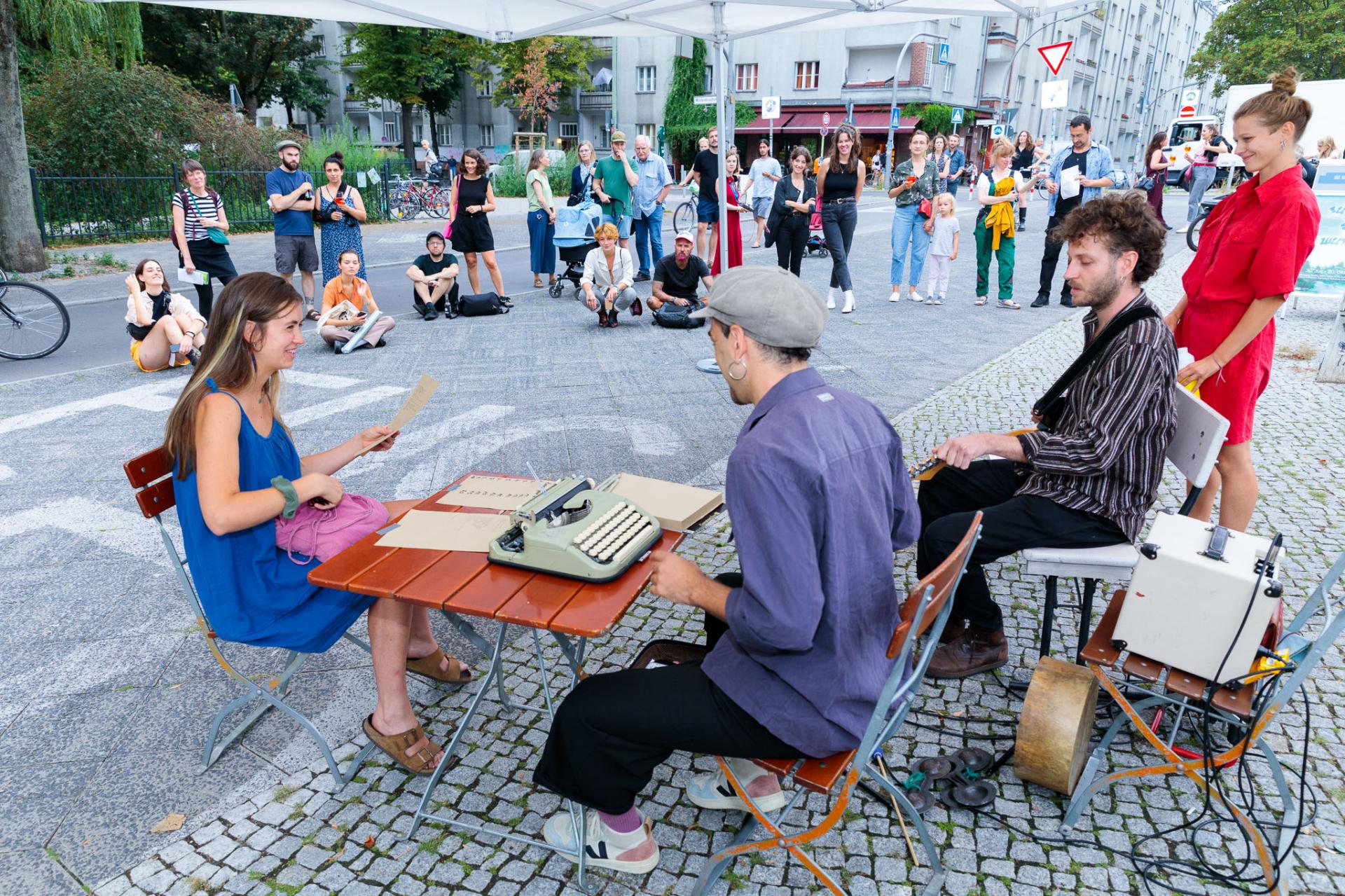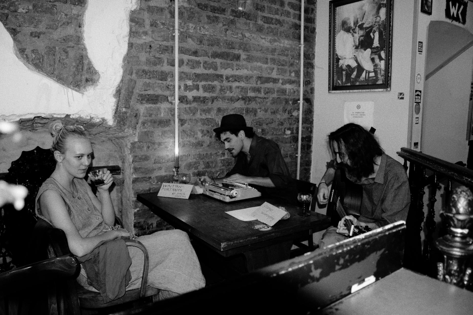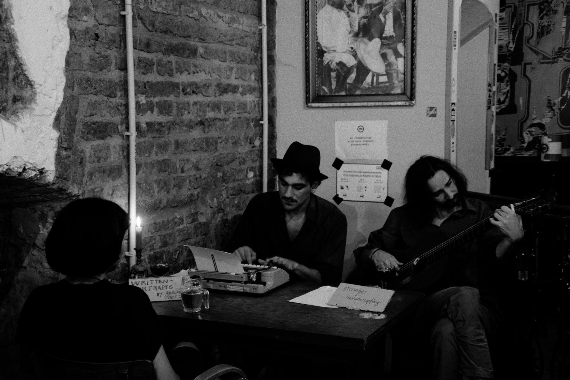 This project started solitarily in a bar in Vienna, the only bar that accepted me to sit at a table in a corner with my typewriter, once a week. Eventually I started to invite other artists to participate and portray people with their discipline. Then the invitations to different cultural locations began. And then the invitations to big festivals in different countries in Europe. I collaborated in the implementation with cultural institutions and organizations and mainly with artists from different backgrounds, nationalities and disciplines.