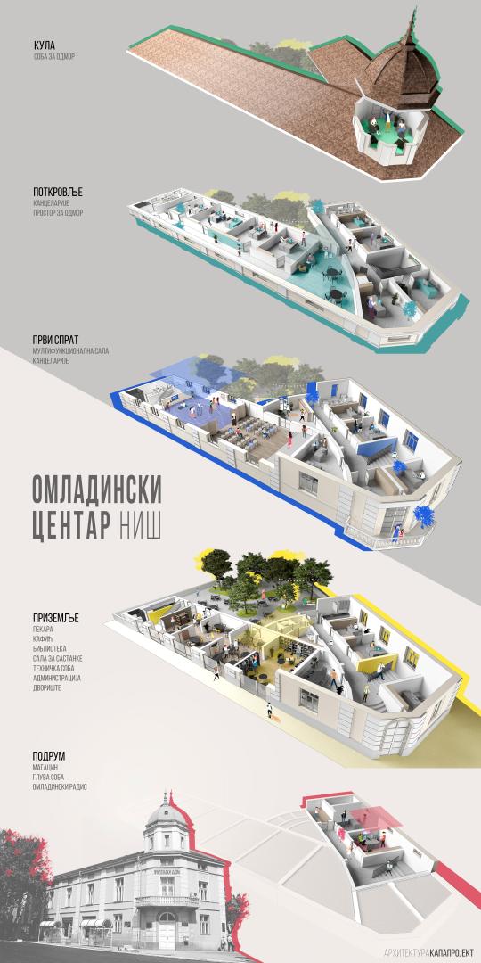 We want to give youth the opportunity to take part in recreational and cultural activities or vocational counseling, this center help them develop their physical, social, emotional, and cognitive abilities and to experience achievement, enjoyment, friendship, and recognition, sense of belonging and equality for persons with disabilities. The concept for our Youth center that we want to make is to cause emotion strives to creates products that evoke appropriate emotions in order to create positive experience for the young users and the space that they use. Motion entanglement that can cause them result dynamic relation between human. Transition of spaces are narratively designed according to the emotion potrayed. Transformation of emotion entanglement into design elements we want to use is trough colours transition, wall + floor + celling finishes, lighting selection, forms/shape, building facade, space planning, floor pattern, style design of furniture and wall treatment. In building used to be a library, that now there will be a "literary bakery" that will make money, that the courtyard that will be refined will hold exhibitions, concerts… So it will retain the traditional spirit that there used to be a meeting place for teachers-educators, and now the youth will gather there and create the future.