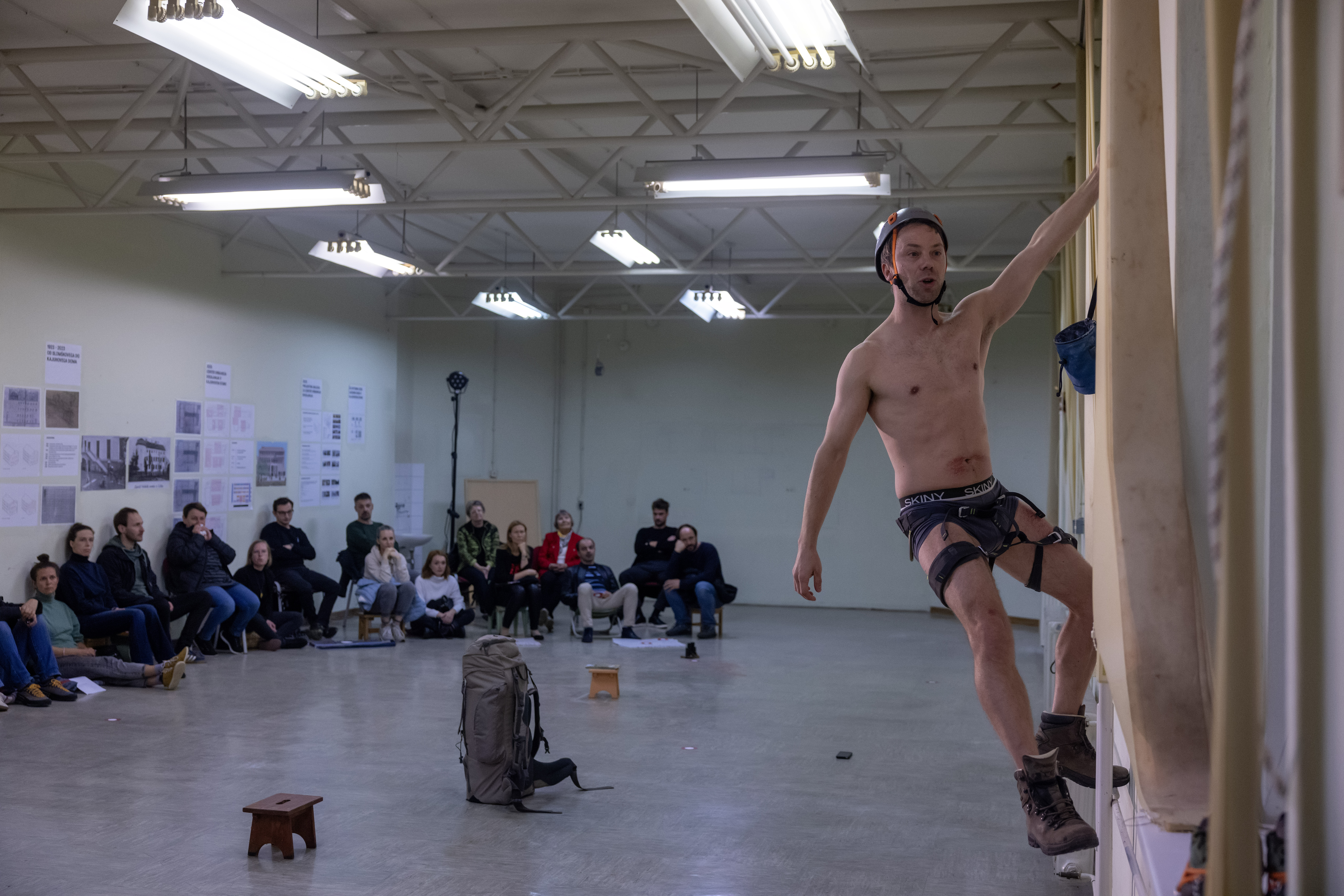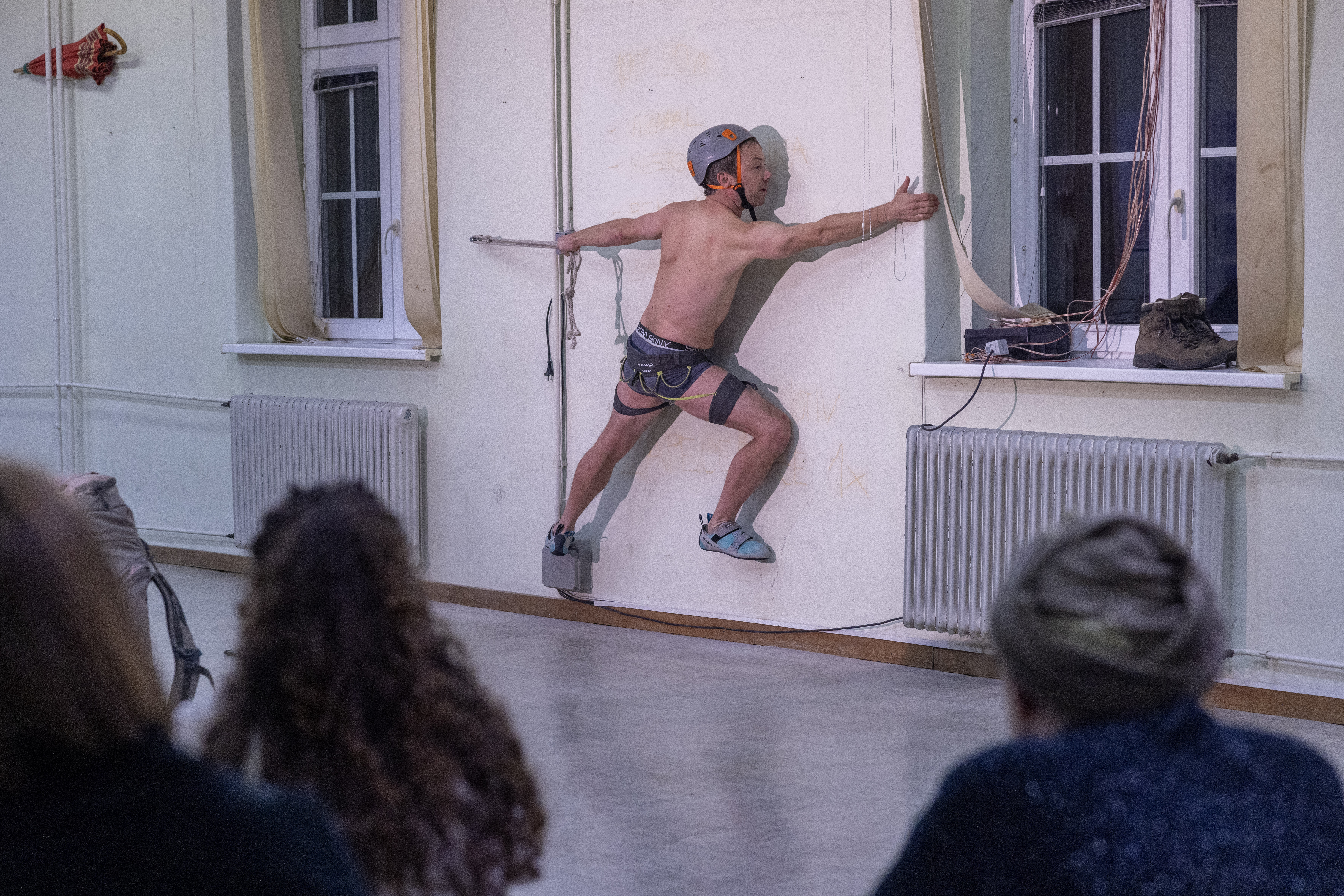 By merging site-specific movement with extreme physical adaptation, this project redefines performative space. Instead of fixed stage designs, it incorporates the natural and architectural elements of mountain huts, trails, and shelters, transforming them into active components of the performance. The vertical and horizontal dimensions of each space shape the movement vocabulary, making every performance distinct. Rather than relying on a predetermined stage, the performer engages with gravity, elevation, and terrain, continuously shifting between climbing, crawling, descending, and traversing surfaces. The backpack serves both as a functional object and a performative device, reinforcing themes of endurance, adaptation, and transition. A central innovation lies in the interaction between performance and environment, where movement through space is not just a choreographic decision but a necessity dictated by the landscape. This approach shifts the focus from theatrical illusion to real-time negotiation with the surroundings. Unlike conventional theater, where audiences remain passive, here spectators engage actively, following the performance as it unfolds. Their perspectives are constantly challenged—they must move, shift viewpoints, or physically reposition themselves to track the action. This direct involvement fosters a collective experience, transforming spectatorship into an act of presence and engagement. By fusing elements of mountaineering, climbing, endurance, storytelling, physical theater, and performance art, the project creates a hybrid form that challenges disciplinary boundaries. Rejecting traditional venues in favor of unpredictable, natural settings expands the concept of performative space, democratizing access to contemporary performance and bringing it to audiences in remote and unconventional locations. The constant negotiation between the body, environment, and audience blurs the line between performer and observer.