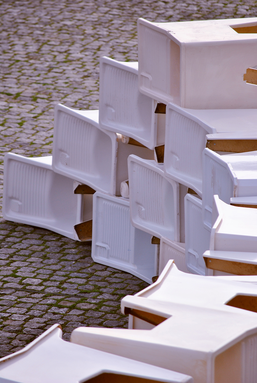 Sabão exemplified sustainable urban intervention by repurposing 150 washing tanks that would otherwise have become waste. The project embraced circular economy principles by transforming these discarded objects into the building blocks of a public artwork, reducing environmental impact and promoting material reuse. Lightweight, reversible assembly methods ensured minimal alteration to the urban fabric, while locally sourced materials, such as reclaimed fishing nets, reinforced environmental responsibility.