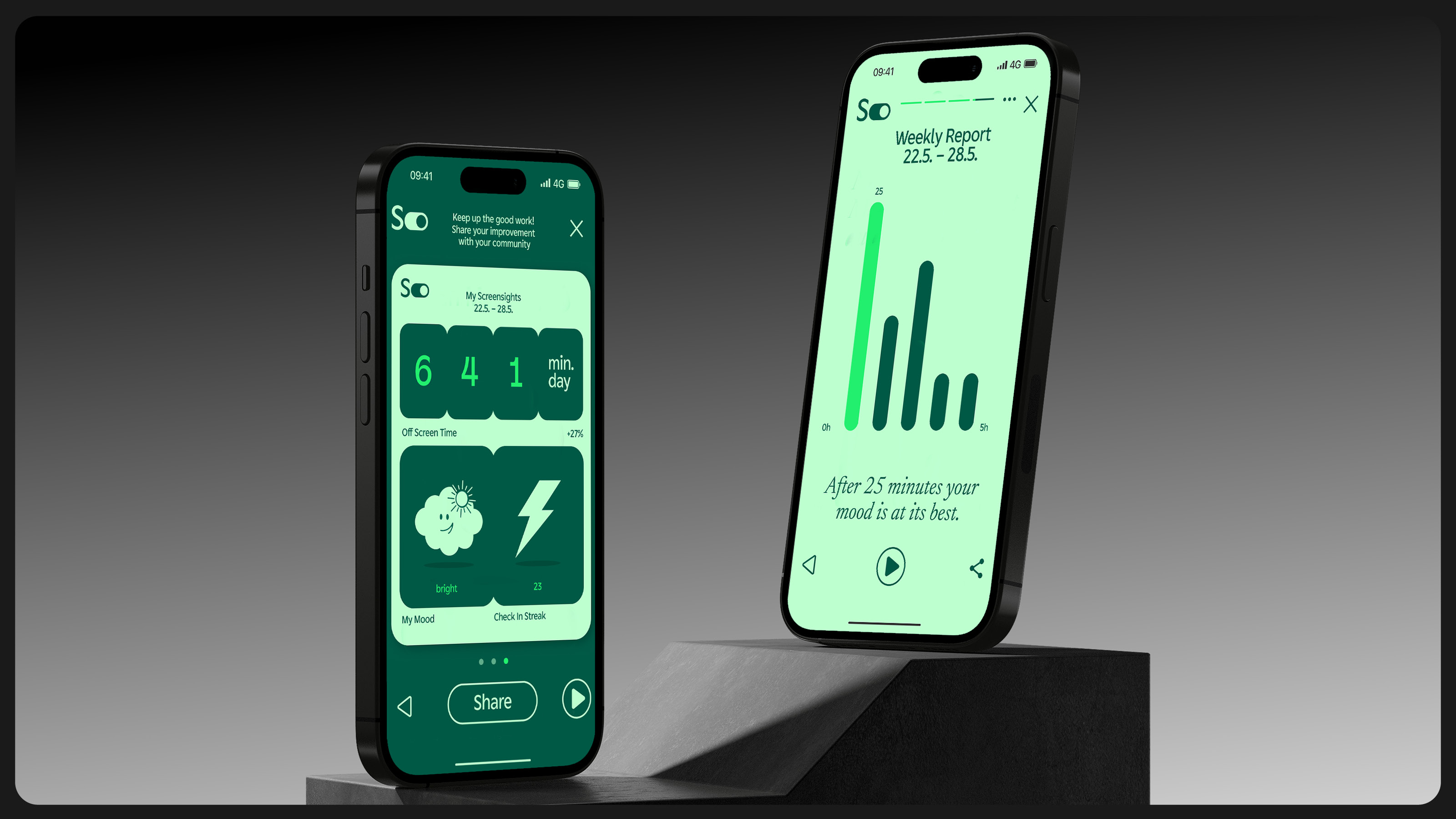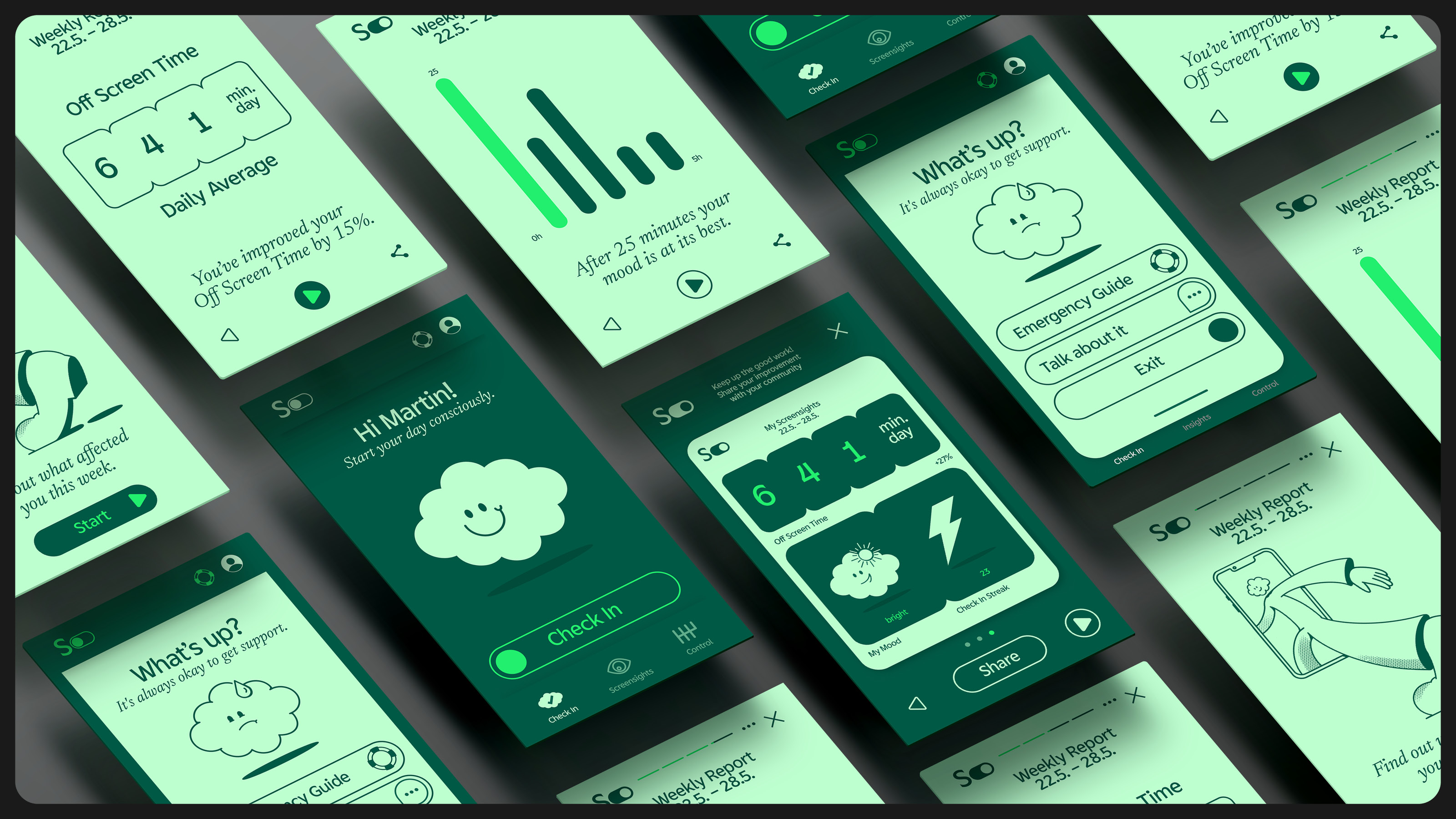 The app’s USP is in the combination of a mood journal and a screentime tracking tool, directly linked to social media consumption. This innovative concept allows for a deep, data-based analysis on the interdependence of online activity and wellbeing – all while remaining highly functional and accessible to it's users.