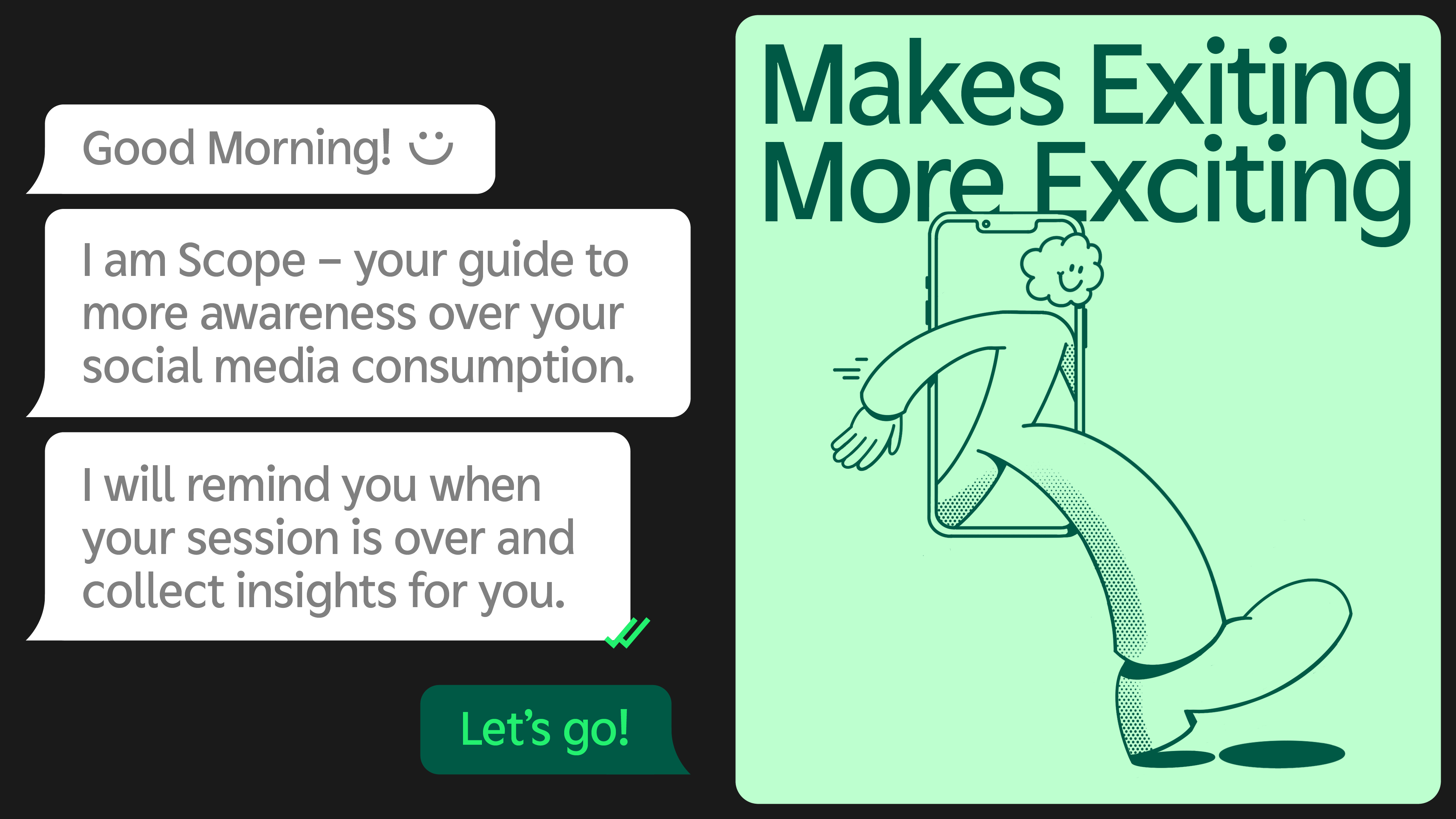Scope tackles these issues, by redesigning how we engage with use social media. It introduces a structured routine around our daily consumption, incorporating a mental health check-in before and a debriefing after each social media session.