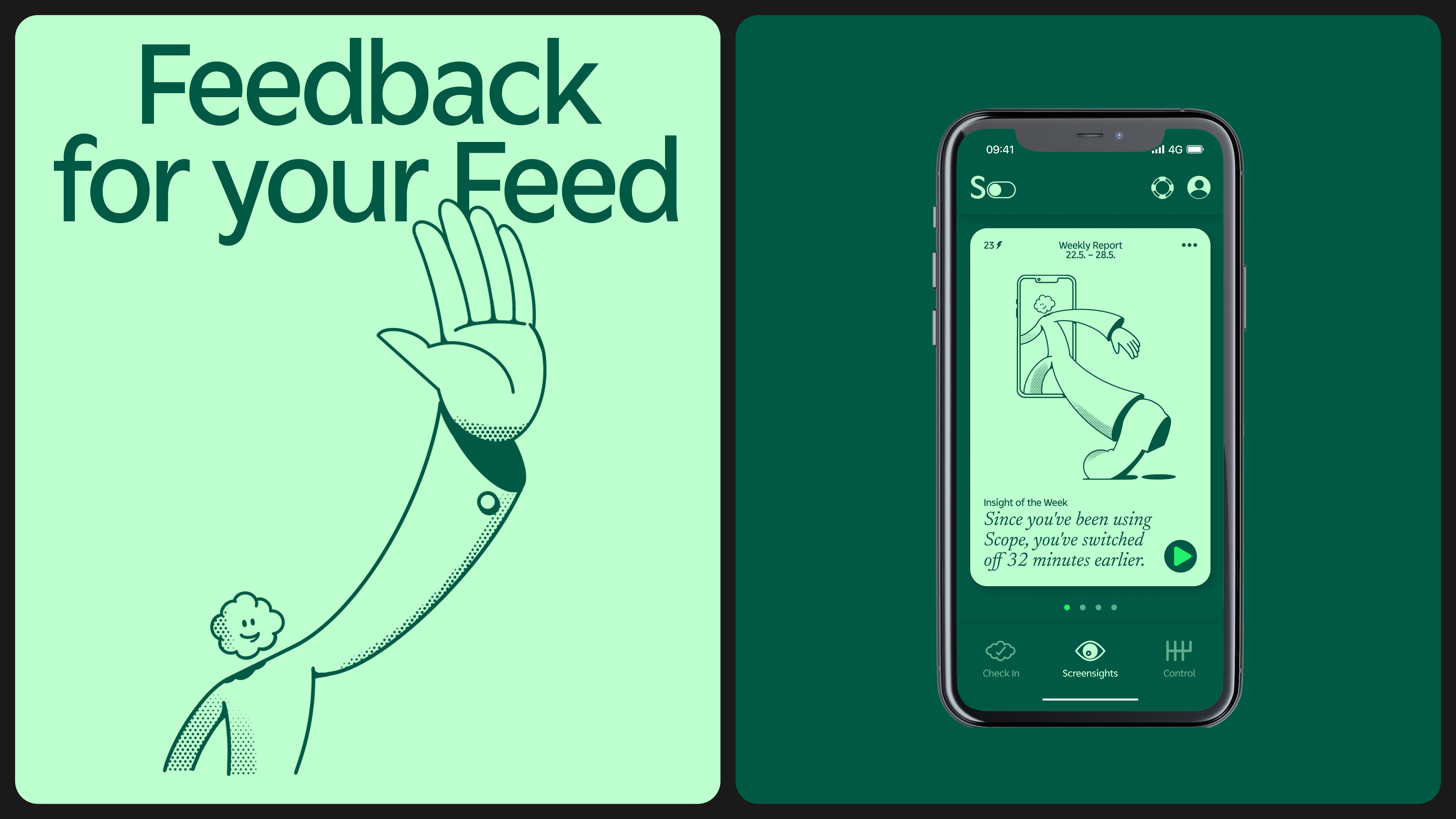 Through a daily check-in, users rate their mood before and after using social media. With the information provided, Scope supports users with weekly insights into their own mental health. By this, it helps them to gain awareness of how their screen time affects their wellbeing. Users are encouraged to build new online routines that enable them to foster a healthier relation to social media.