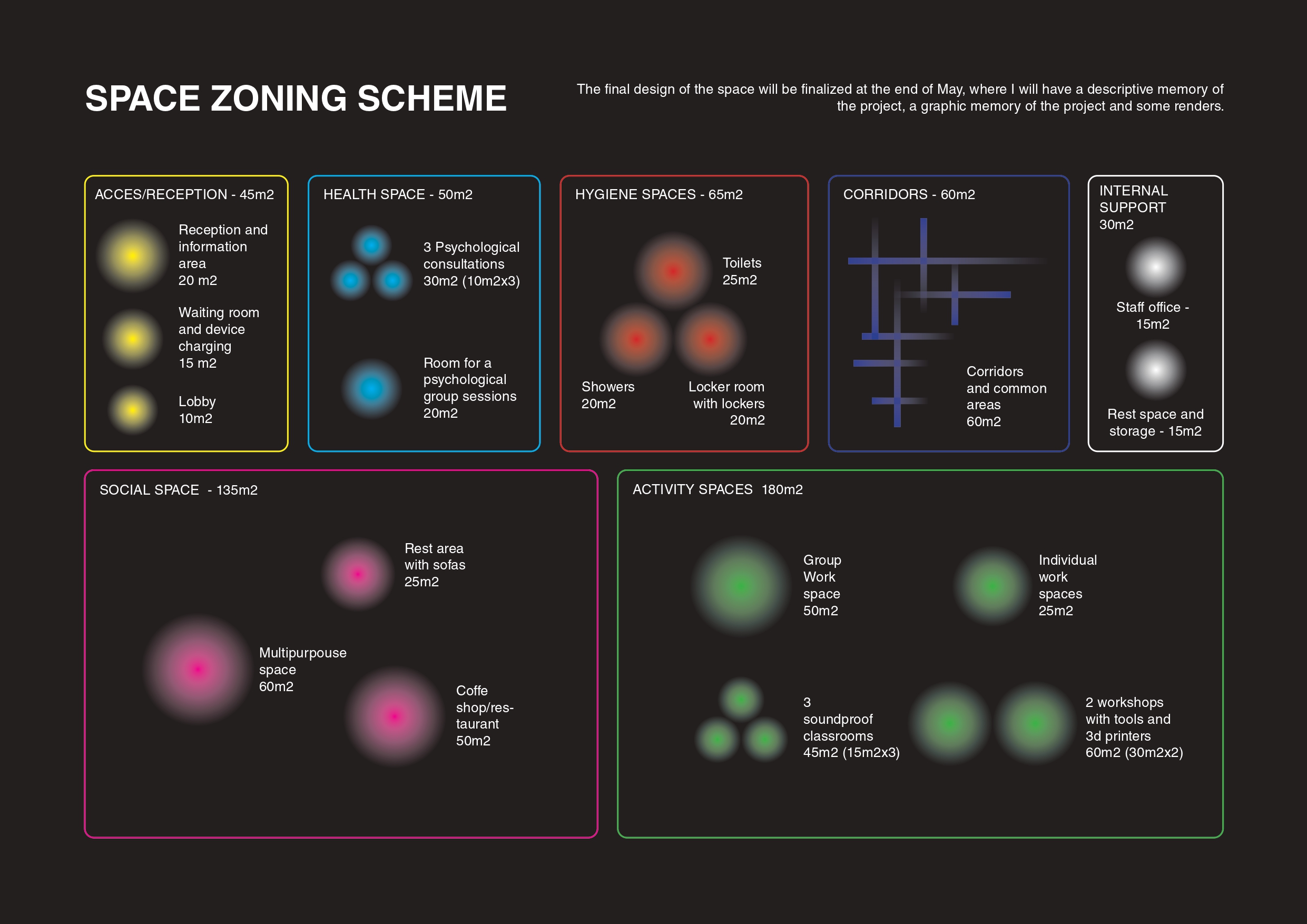 All the spaces could be applied to different urban municipalities across Europe. As for the methodology, it could also be applied in various locations since it is a fairly general work methodology. The materials and furniture will be 3D printed and/or made from recycled, reused, or naturally sourced materials. Additionally, virtual reality will be used in cases of drug and/or alcohol addiction, as several studies conducted in the United Kingdom show that it helps improve and treat these disorders. The lighting will be chronobiological lighting, which follows the pattern of natural sunlight to improve indoor quality of life. However, for functional spaces like work areas, there will also be inverse chronobiological lighting, as it will follow the same pattern as sunlight, but since this is a center that will operate at night and natural sunlight will not be present, it is referred to as "inverse."