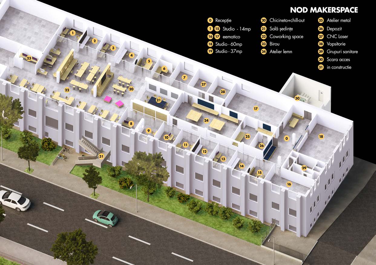 While most makerspaces focus on either fabrication or co-working, Nod is a hybrid model, combining state-of-the-art prototyping tools, educational programs for skills development (Solidarity FabLab), public engagement initiatives (Dâmbovița Apă Dulce), business incubators for creative entrepreneurs
