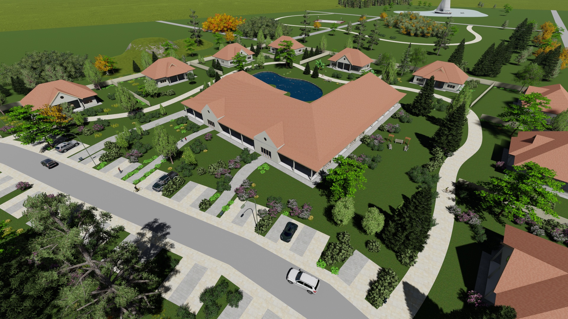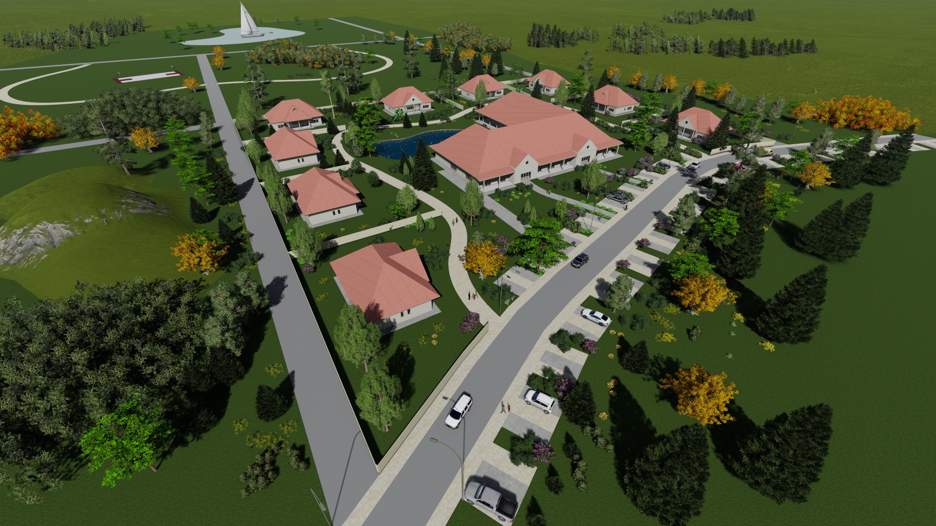 The central element of the project is an innovative elderly care center which offers community housing solutions for middle-aged and elderly people who wish to age consciously, as well as for people living with dementia. The central building of Liget Park will provide accommodation for elderly people with dementia and their caregivers. The ground floor of this bulilding will be open to the public, offering health and wellness services such as fitness, physiotherapy, community spaces, programs, a café and a restaurant. Other buildings within the complex will feature modern, wheelchair-accessible apartments, allowing residents to actively enjoy their retirement while being part of a vibrant village community. Should they require support, professional assistance will be readily available. The Liget Park will be surrounded by a permaculture farm, ensuring access to fresh, healthy food for both residents and the local community. The buildings are designed to be sustainable, human-scaled, comfortable, and seamlessly integrated into the natural landscape. By introducing the silver economy to this currently service-deprived region, we aim to create job opportunities and access to high-quality services for both residents and the wider local population.