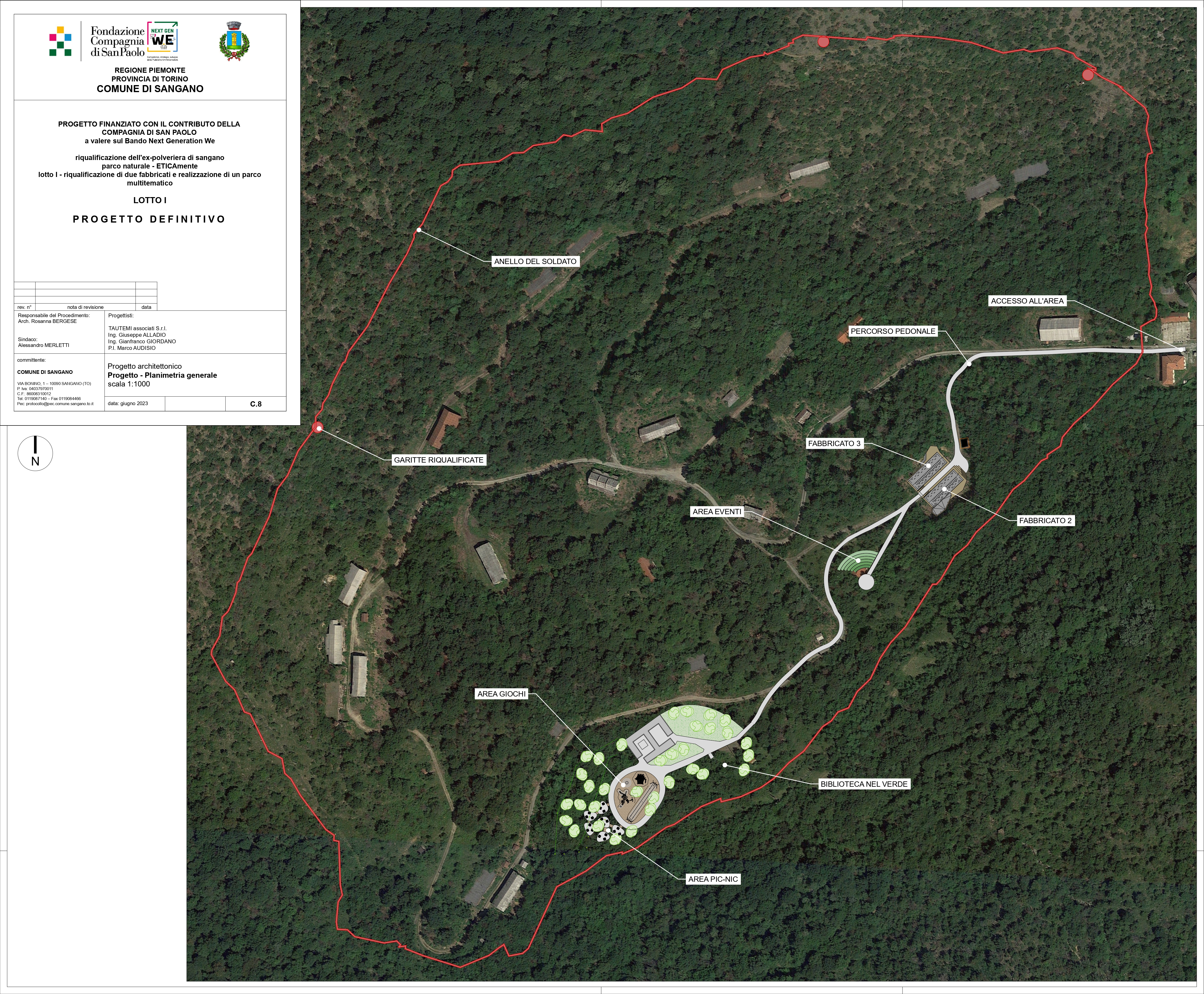 The Sangano project breathes new life into a 52-hectare forest, formerly home to a Gunpowder Magazine and its 40 barracks. This ambitious redevelopment will create several spaces, including a forest library, a permanent market showcasing local products, a forest school, sports and sensory trails, a refreshment area, and an innovation hub for green and digital start-ups and experimental academic activities. Addressing the area's hydrogeological instability is a priority, with mitigation measures planned, such as a self-filtering, partially swimmable lake. Currently, the project has secured funding from foundations for a complete preliminary design and from the Piedmont Region for the rehabilitation of the external perimeter (destined to become a sports and tourist circuit), the construction of an open-air amphitheater for schools and associations, and the design of the hydrogeological interventions. All facilities will adhere to DNSH criteria and be powered by renewable energy sources. Photovoltaic systems will also contribute to the local Renewable Energy Community, already established by the Municipality. Following site stabilization, private investment will be sought for the rehabilitation of individual plots/barracks through project financing and crowdfunding. The project has benefited from targeted engagement with local and major national associations: extensive participation paths were activated both in the preliminary and executive design phases. Today the executive design of the external perimeter has been activated, in search of a mix of beauty, innovation and recovery of the historical memory of the place by the Community.