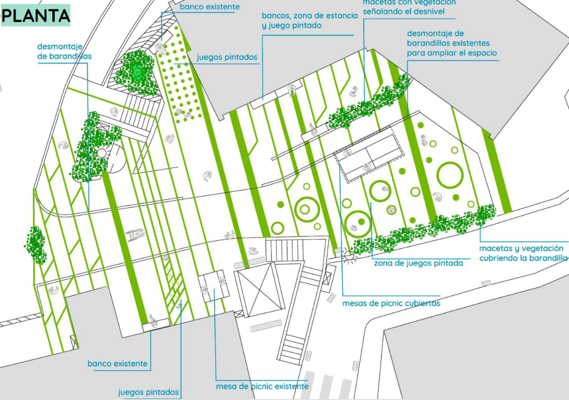 By improving the urban space and incorporating more green spaces as requested by residents, the design creates an ecosystem that coexists with the community. Adding plants offers a cooler atmosphere and shade, while also improving air quality and enhancing biodiversity. Additionally, closing the space to parking reduces noise and air pollution, contributing to a healthier urban environment.