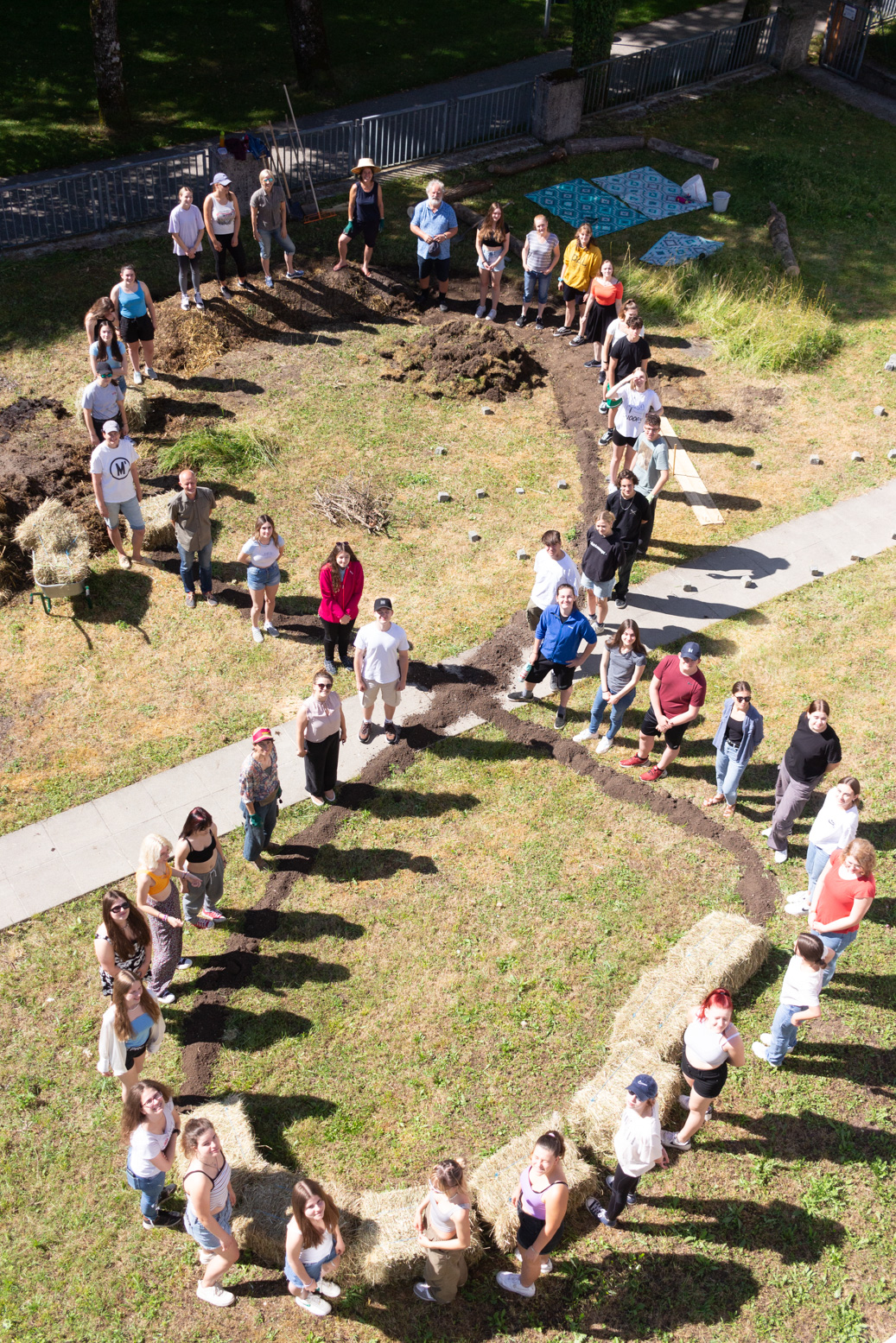 Those 40 students who were given the opportunity to participate in the planning and construction of the Garden of Moving Time will hold this experience for long. Taking part in a long-term and experimental project with international artists and a number of recognised experts as part of their school education has a special quality and depth. Learning that the human body has been understood as the basis for measuring the space and dimensioning the garden during this embodied and sensitive planning process is a very valuable experience in itself. The students and teachers were actively involved in numerous participatory modules during workshops and the construction phases of the garden. From digging and planting a raised bed for test purposes, sensorily exploring the herbal flora in the region, designing communication elements to the construction of a horizontal sundial under the guidance of a stonemason. The students were introduced to various design strategies and craft techniques, many of which are ecological gardening methods that do not use any plastic material or artificial fertilisers and rely on regional products such as sheep's wool and horse dung. The students will probably also never forget the first picnic on the school grounds by using a solar grill, completely without fossil fuels or electricity.