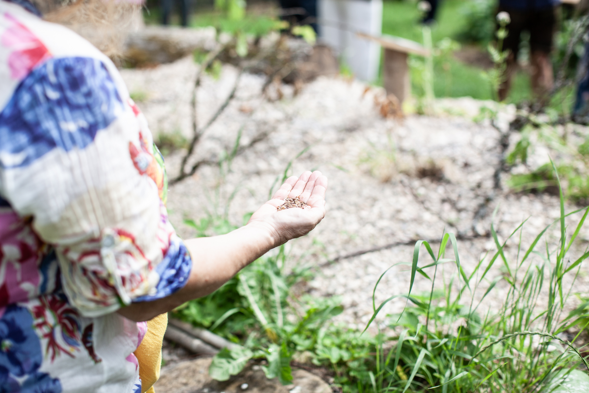 Apart from that, an open space has been created to be used as a lounge and break room—to meet, chill out and to celebrate. It's also a space for having snacks and lunch, just take a seat on the newly built seating areas. Or grab a picnic blanket and relay in a hammock, a place to be and to think-feel with the earth. Potentially also a space for cooking—an open-air kitchen is to be built in a follow-up project.