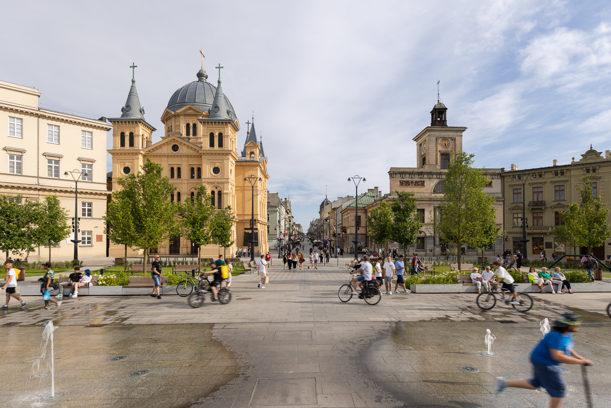 The redevelopment of Freedom Square in Łódź aimed to restore the historical significance and social functionality of one of the city's most iconic public spaces. Once dominated by tram tracks and vehicular traffic, the square was transformed into a vibrant, pedestrian-friendly area that enhances urban life. The comprehensive redevelopment, completed in the spring of 2024 under the Łódź Area Revitalization Program, introduced 64 trees, rain gardens, and permeable surfaces reducing the urban heat island effect. The square now includes dedicated areas for recreation, relaxation, and cultural events, making it accessible and welcoming to all demographic groups, including children, seniors, and individuals with mobility challenges. The target groups of the project include Łódź residents, visitors, and local businesses, who benefit from a revitalized urban center that fosters social interactions and improves quality of life. Specific objectives included increasing the biologically active area, promoting sustainability through innovative water management systems, and preserving the historical character of the space. The redevelopment of Freedom Square also shifted the focal point of Łódź’s city center, integrating areas that were previously fragmented into isolated pockets. By enhancing pedestrian connectivity between these spaces, the project has transformed the movement dynamics of residents, encouraging sustainable, active mobility. This seamless integration fosters a more cohesive urban experience, where walking and cycling become natural choices, reducing reliance on vehicular transport and promoting a healthier, more connected city life. The square now hosts cultural events, encourages everyday activities, and serves as a platform for community interactions. This project harmoniously combines historical preservation with modern urban sustainability principles, establishing Square as a model of sustainable urban regeneration.