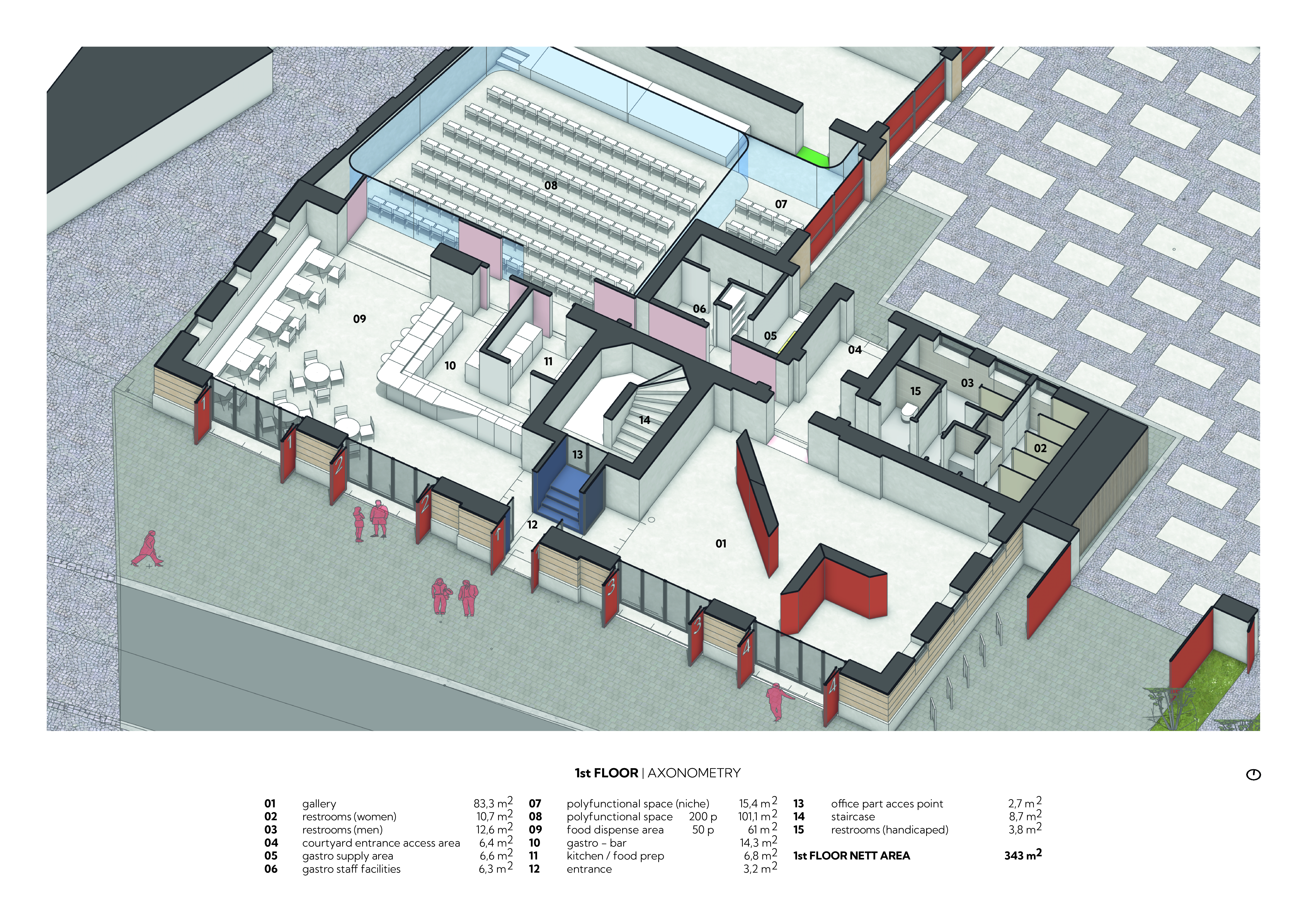 • Ground Floor: The gastro operation, multifunctional hall, and exhibition space are highly accessible to the public. The gastro operation serves as a social hub where residents and visitors naturally meet, while the multifunctional hall hosts community events, workshops, and pop-up gatherings that draw diverse audiences. The exhibition space provides a dynamic platform for local artists and cultural projects, inviting dialogue and creative expression.