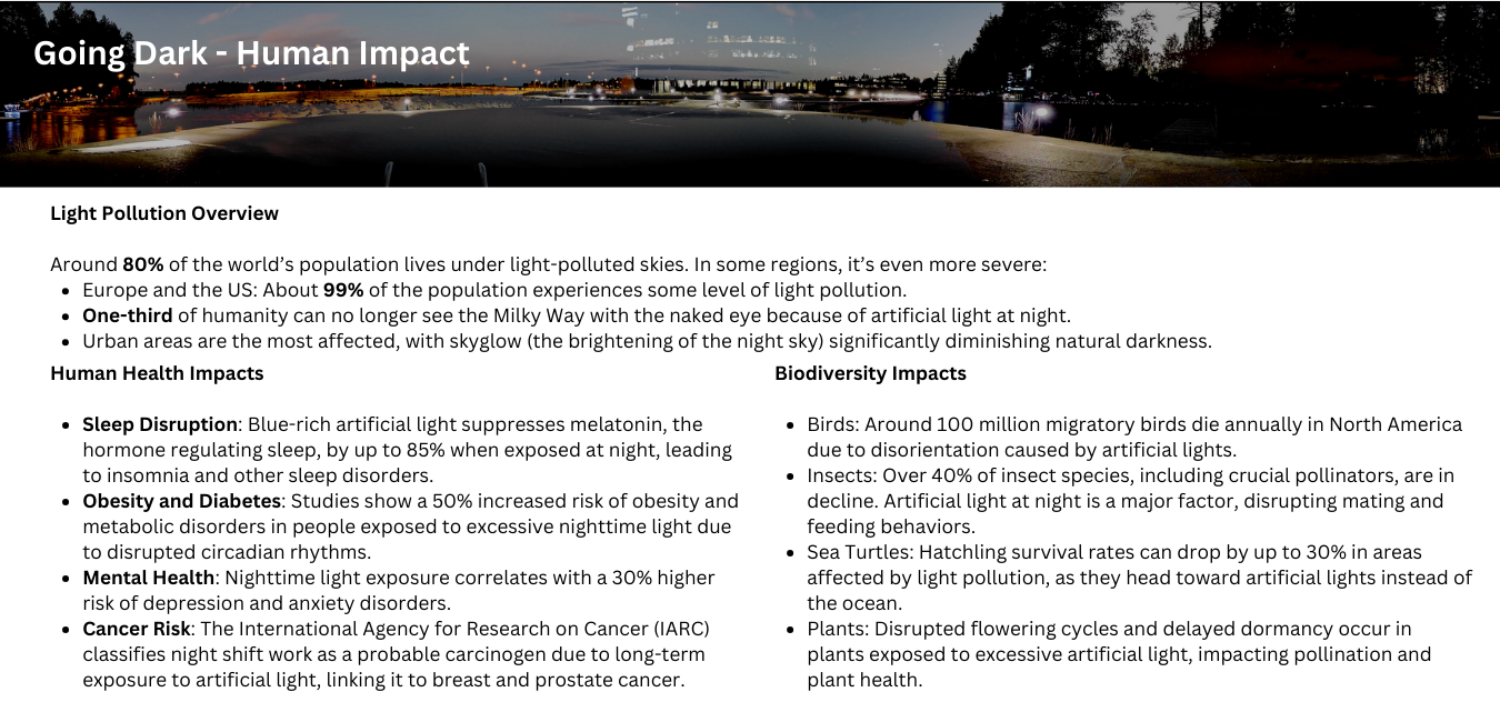 By focusing on local engagement and collaboration with municipal stakeholders, Going Dark demonstrates how small-scale efforts can contribute to solving a global issue. The model can be adapted to other cities, showing how local action can pave the way for meaningful environmental change on a larger scale in a broader scope of regions.