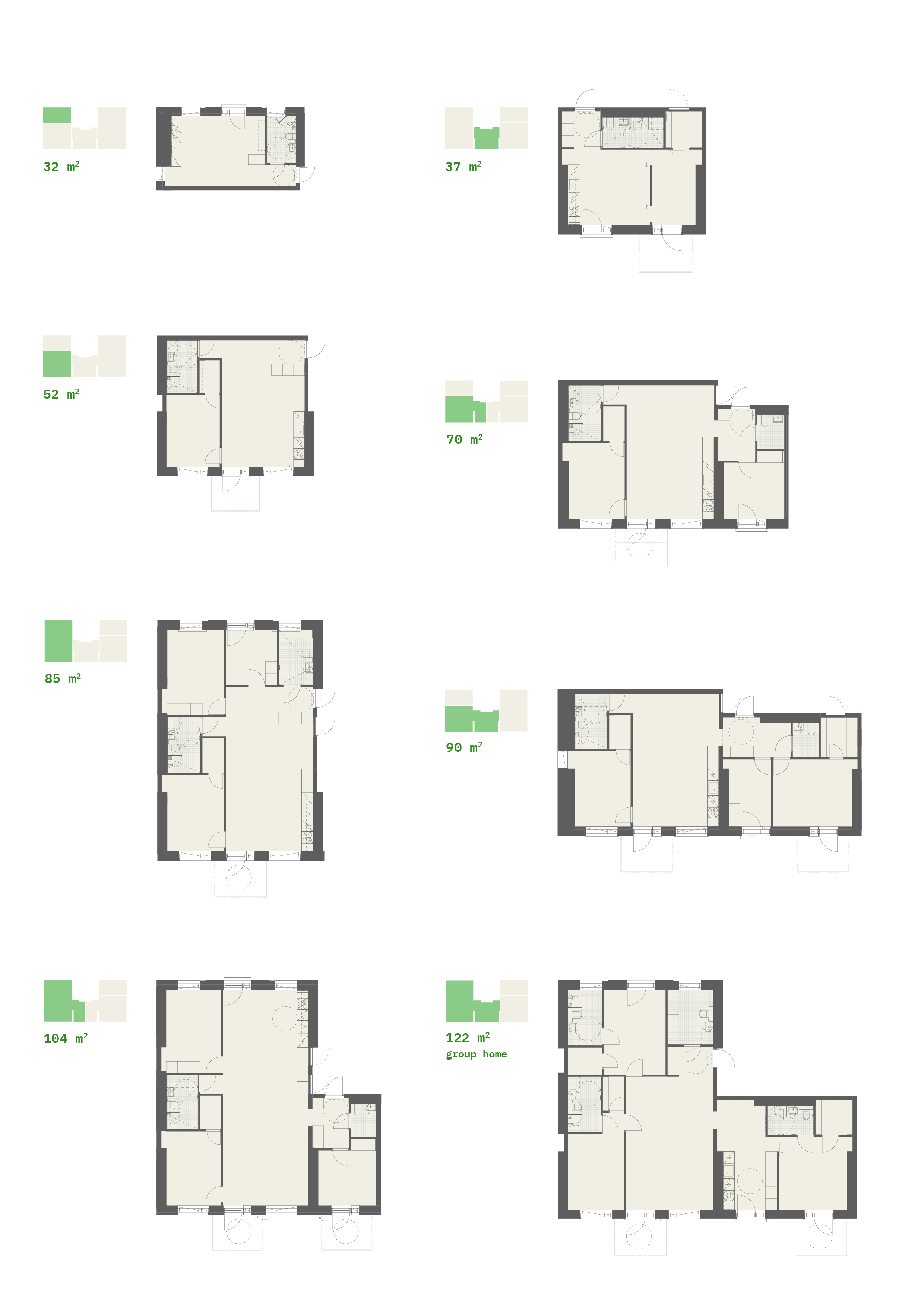 The adaptable and flexible contexts of the building enhances the diversity of the inhabitants, as the dwelling distribution can change continually and relocate different needs and aspirations. As the units can be composed into different sizes of apartments, different kind of households can occupy them from solo dwellers to families and group housing. There is no need for example to determine the number of single room dwellings when markets steer towards smaller dwelling. This has a tendency to promote short term living and connection to place. However, single room dwellings can always be found in the building reflecting the needs.