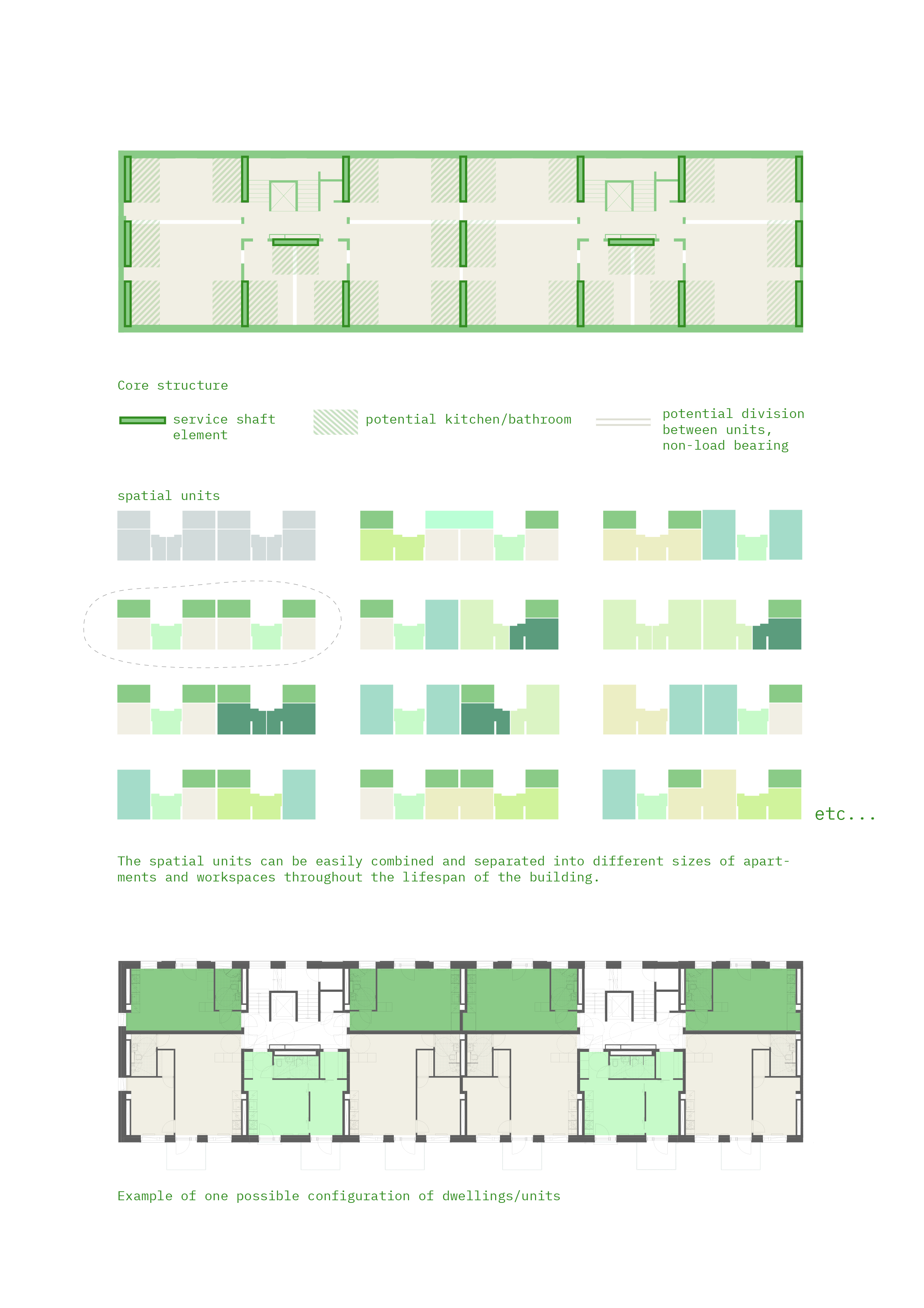 The sizes of the apartments and their spatial solutions can be easily modified throughout the whole life span of the building, to house the changing needs of people and societies, and thus advance the endurance and resilience of the built environment.