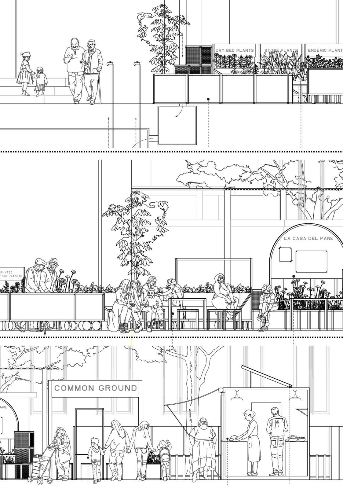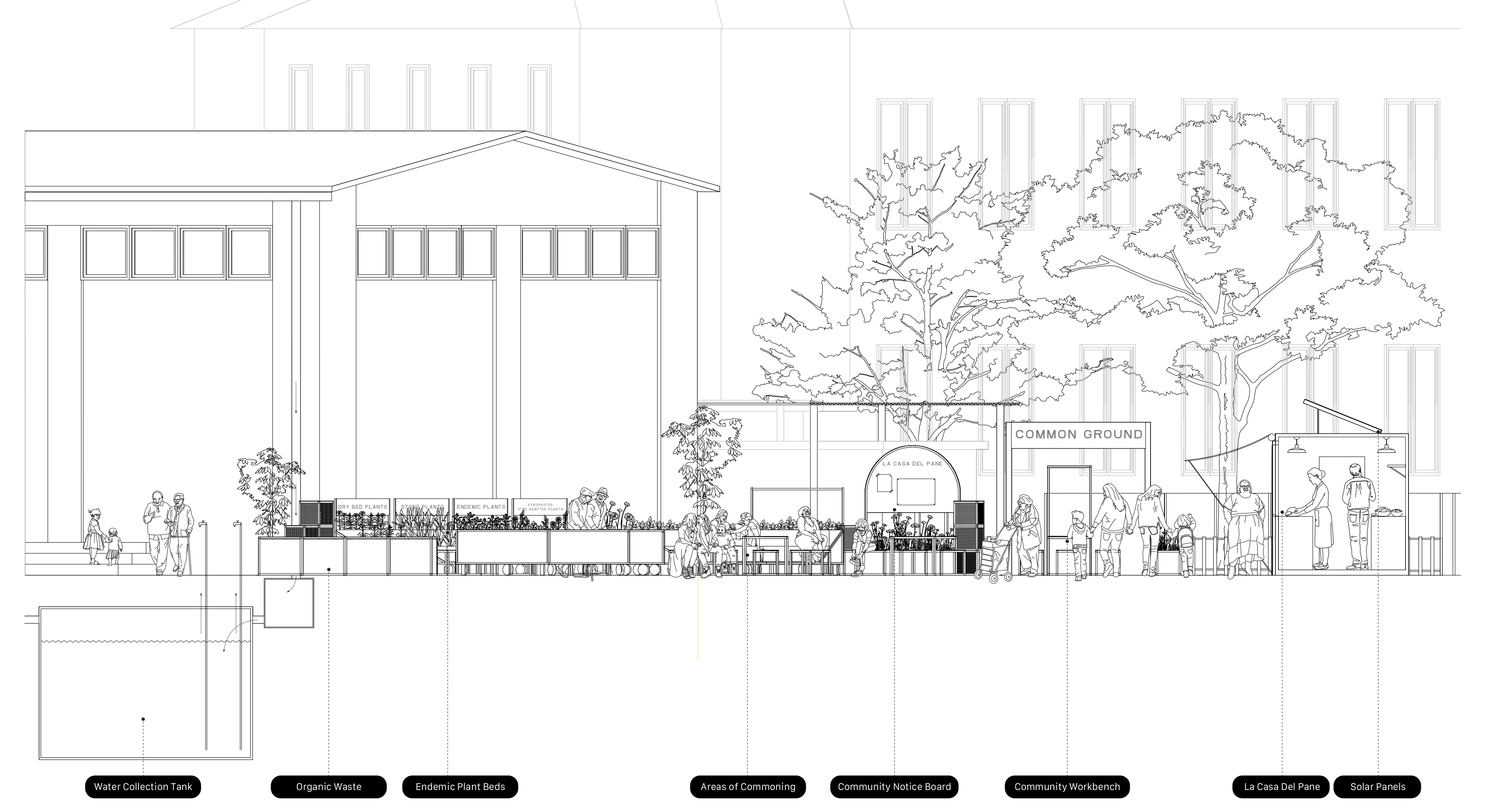 A key component of Lot 3 is the adaptive reuse of two repurposed containers, transformed into a Baking Home ("La Casa del Pane") and a community kitchen. These modular structures reduce material waste and embodied carbon while incorporating passive cooling and natural ventilation ensuring energy efficiency. Designed as a hub for food literacy and low-tech sustainable practices, they encourage hands-on climate education, where students and citizens engage in activities that enable low-impact living and climate responsible resource management.