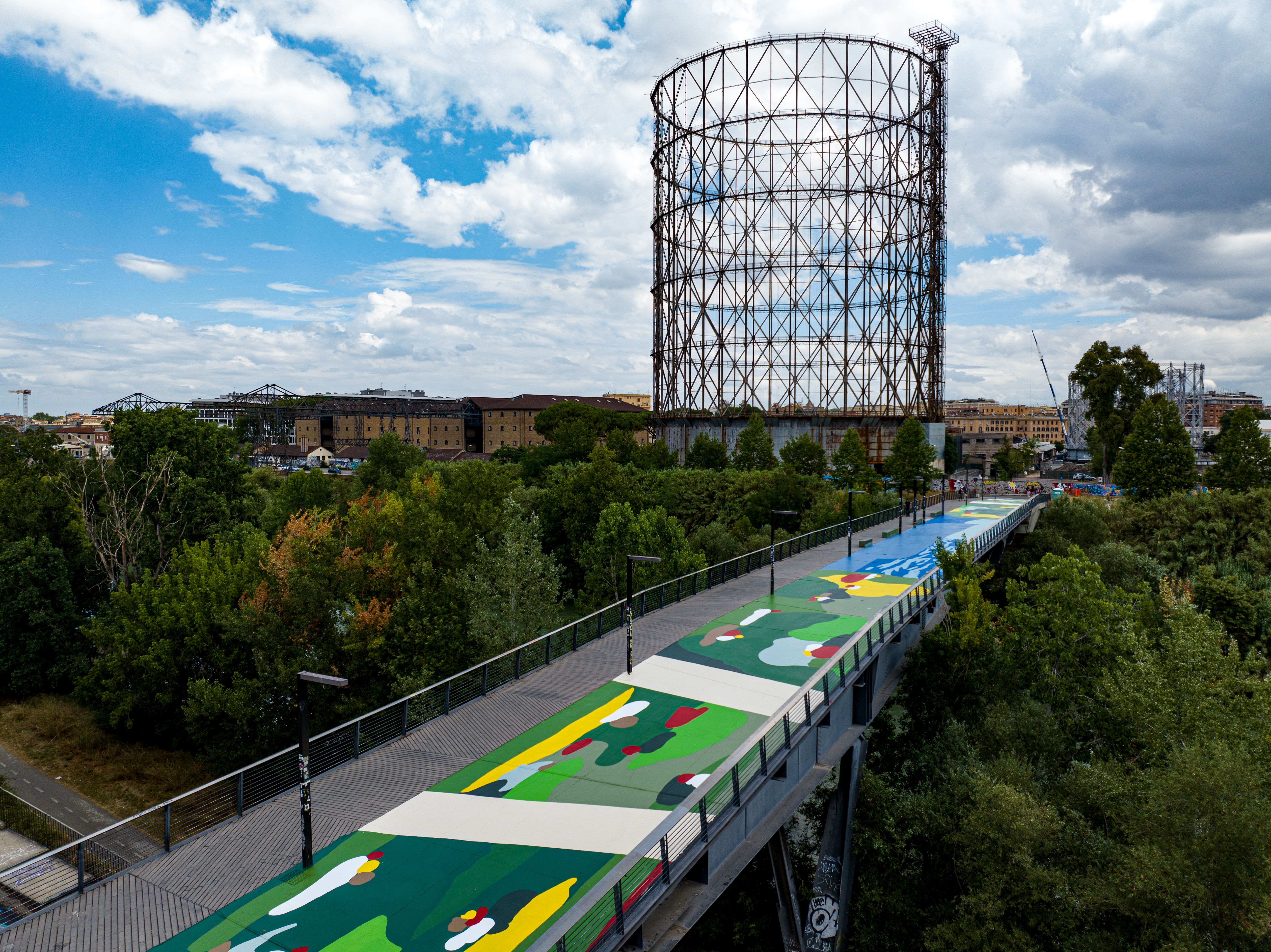 A path of artworks created specifically for Industrie Fluviali by Andrea Casciu, Officinadïdue, Lorenzo Malloni, Leonardo Crudi, Carla Rak and Geometric Bang connects the space to the territory, to its natural and industrial history and to its identity as a "street art district".