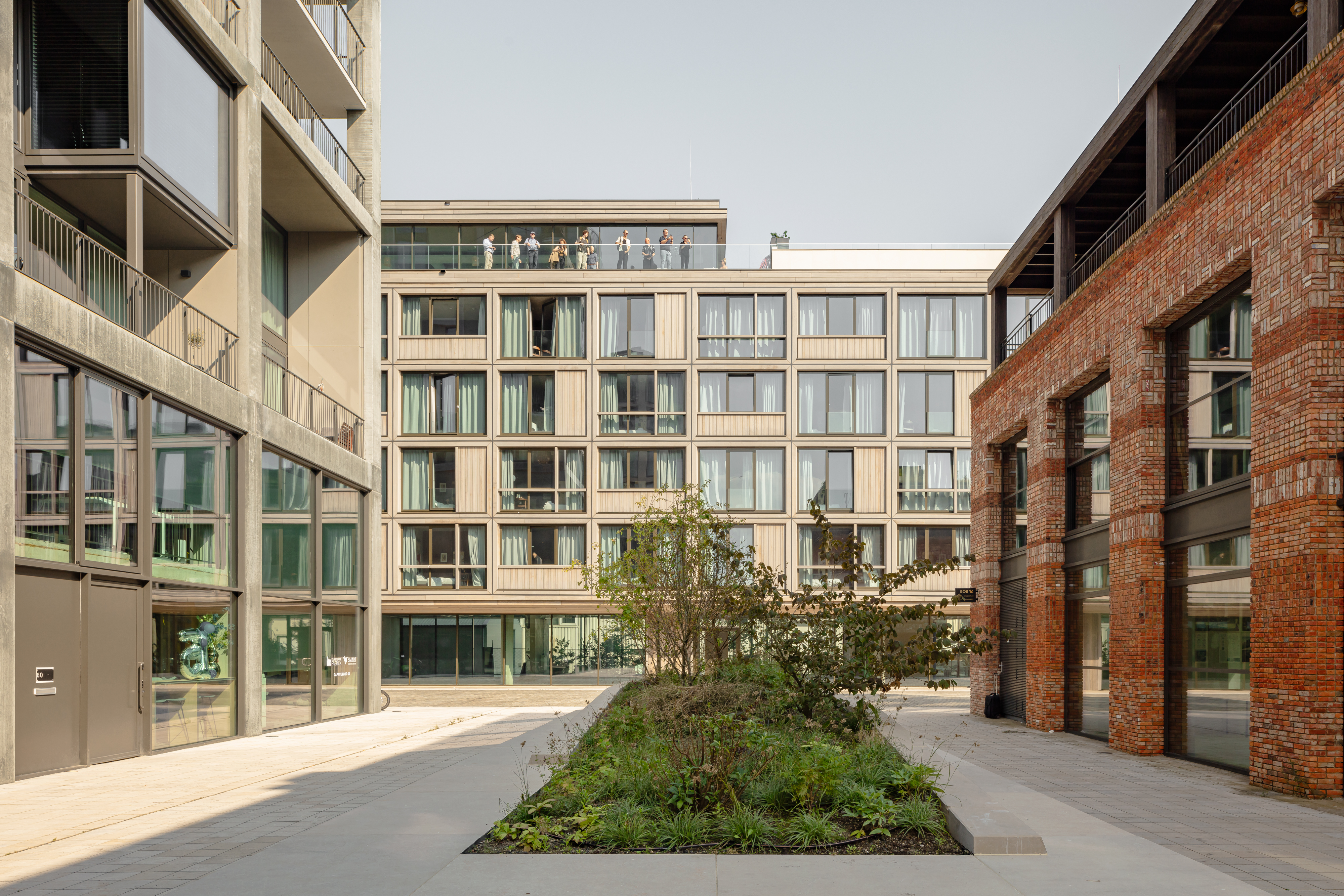 The six sculptural buildings form a cohesive urban ensemble, each with its own unique character while contributing to a shared architectural identity. The white residential block, built with specially profiled, partly recycled concrete, offers a timeless, robust appearance. The apartment-hotel building is clad in warm wooden facades sourced from renewable materials, while the warehouse office is made of durable Corten steel with extra clear height, making it suitable for various uses, including light manufacturing. The brick façade of the café and co-work building is constructed from recycled bricks with manipulated textures and patterns, creating a distinct tactile experience.