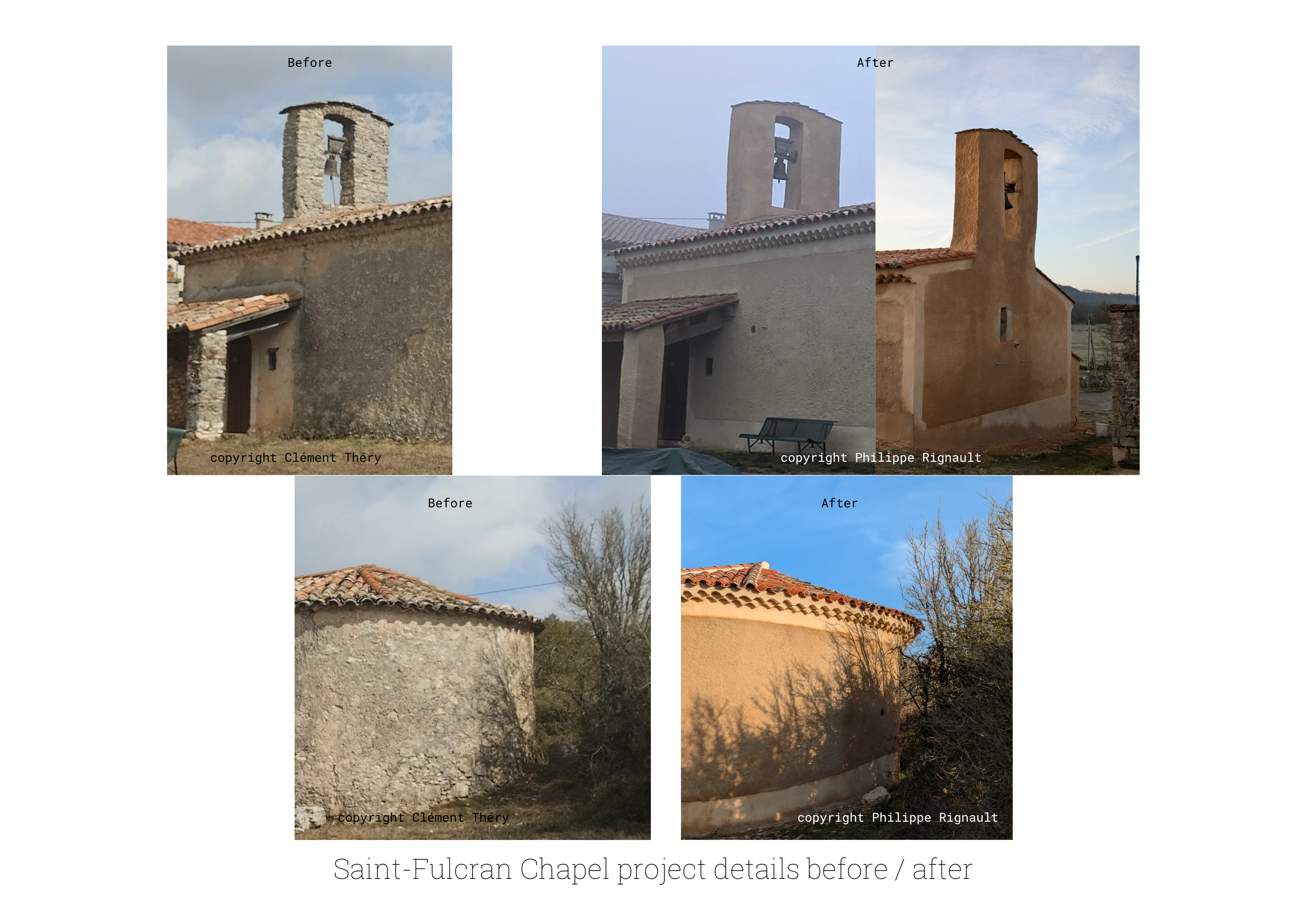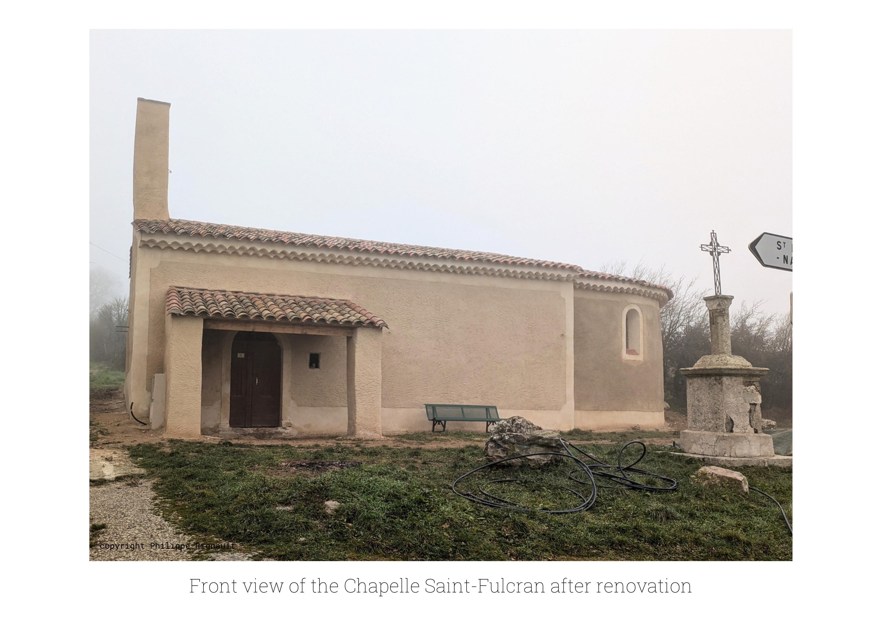 The redevelopment of the Chapelle Saint Fulcran will enable it to remain part of the village's heritage, respecting the original building, in particular by using old techniques for the exterior rendering and keeping the bell, preserving the symbol for the local population (in particular for the inhabitants of the hamlet of Coulet) and preserving its role as a meeting place.