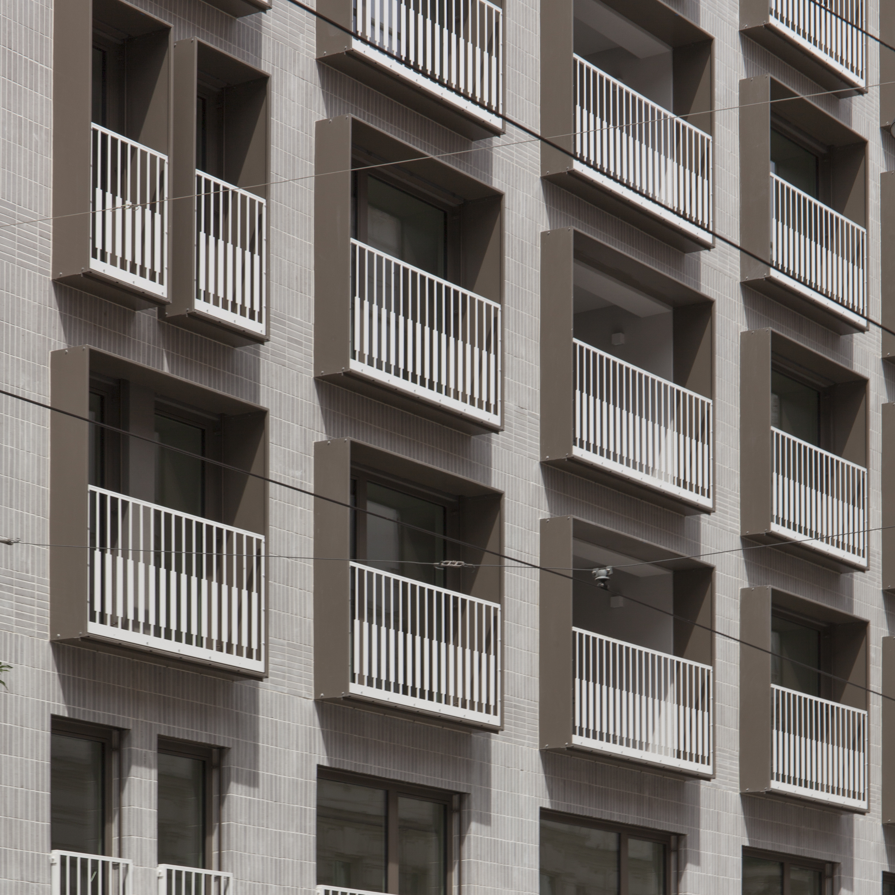 The revitalization project in Porzellangasse is an example of best practice in dealing with a building from the 1990s. The original building from 1998 was used as an office building. Now it houses a commercial space on the first floor and 24 apartments that meet the contemporary standard of a city apartment. The existing building was neither visually nor technically outstanding and only partially complied with official requirements. Demolition was never an option and would have been extremely difficult due to its location on Porzellangasse, which is served by a tram. A contemporary approach to the existing building for ecological reasons and a sustainable approach spoke in favor of preserving and converting the building. Most of the 24 apartments open on both sides of the building, allowing ventilation and providing additional outdoor space in the form of balconies and small terraces. Creating additional outdoor space was an important concern for the architects. The view to the outside and the ability to open the apartment not only increase the standard of living, but also visually enlarge the apartment. When designing the street-side facade, special consideration was given to the appearance of the building, and the color and materiality of the neighboring buildings were considered. Light grey clinker brick slips, alternating horizontally and vertically with the floor boundaries, give the front of the building a classic structure. The color of the dark window frames also reflects the street scene.