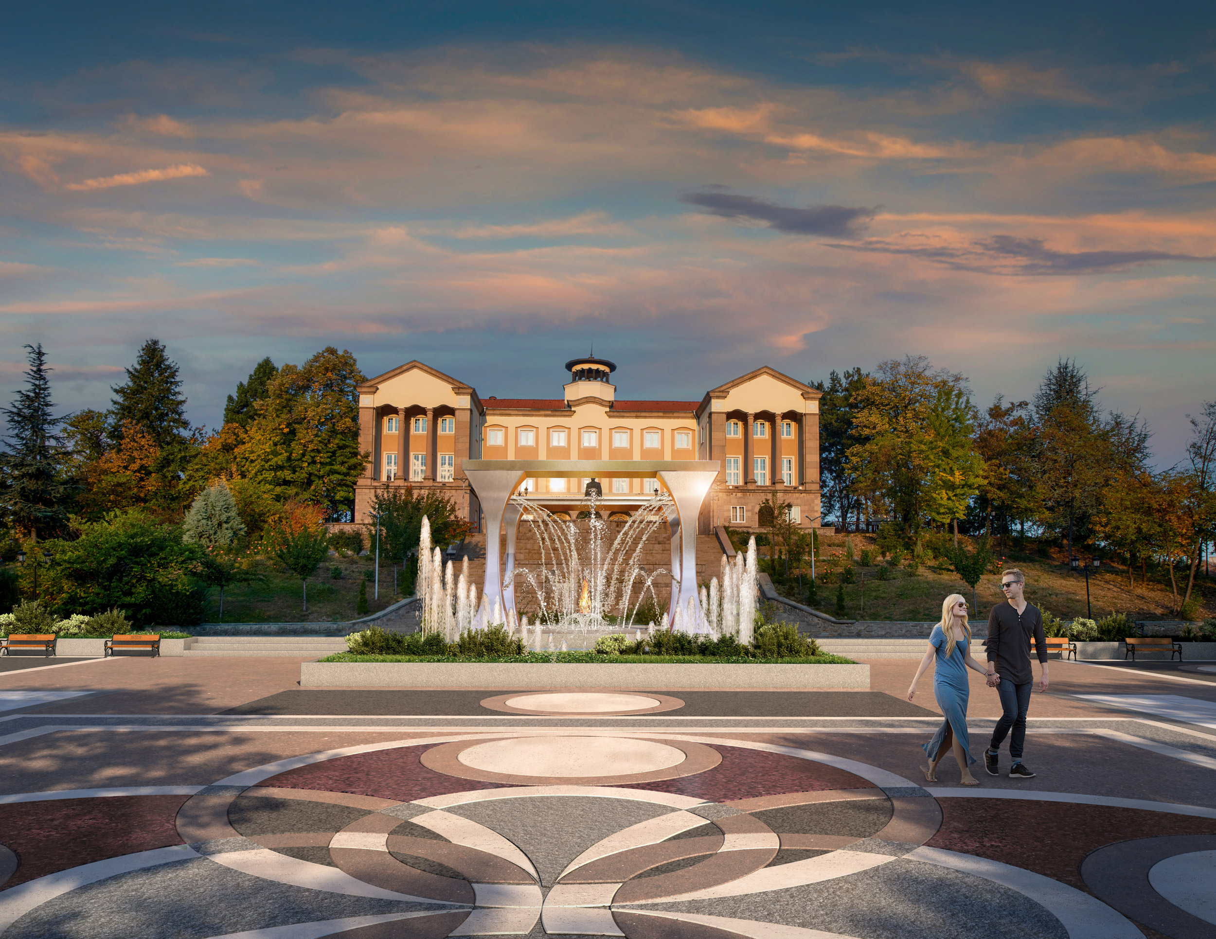 Innovative Public Space – A fountain-stage with a fire and water jet system, symbolizing the town’s resilience and history.