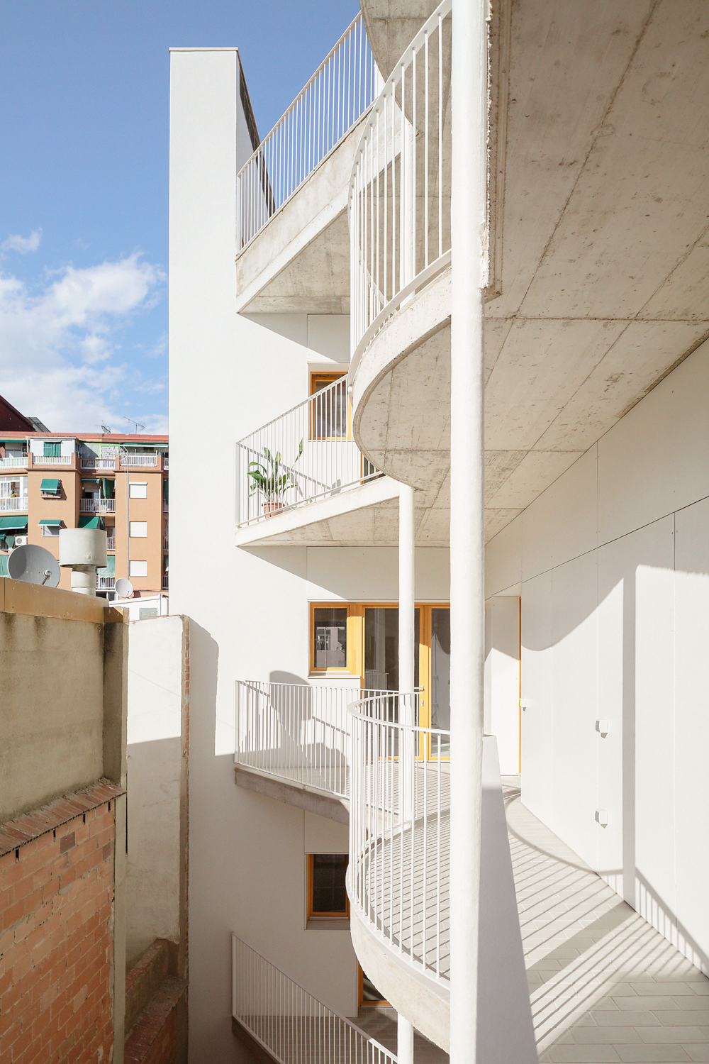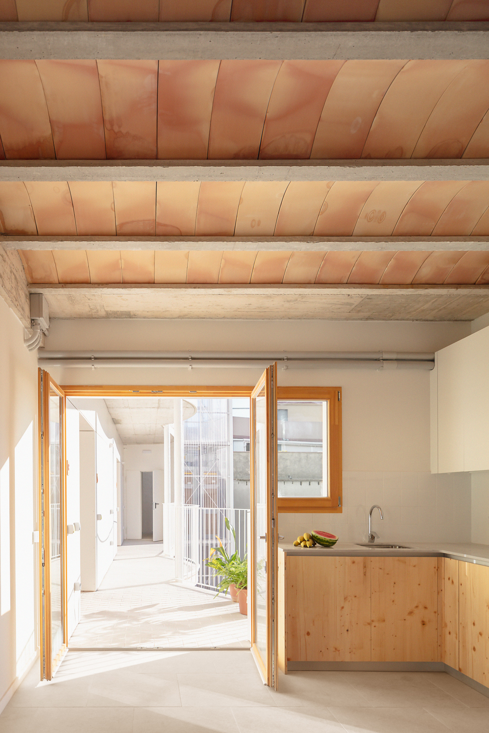 La Morada has an A energy certificate, with an energy consumption of 2 kWh/m² per year and 0 CO₂ emissions per m² per year. It aims for high comfort both in winter and during Barcelona’s harsh summers. To control heat without using air conditioning, the building is externally insulated and takes advantage of its high thermal inertia, making use of the mass of the exposed concrete structure and ceramic materials without additional coatings. The homes are equipped with underfloor heating and cooling, powered by a centralized aerothermal system linked to solar panels.