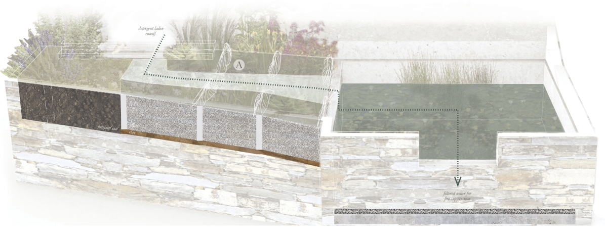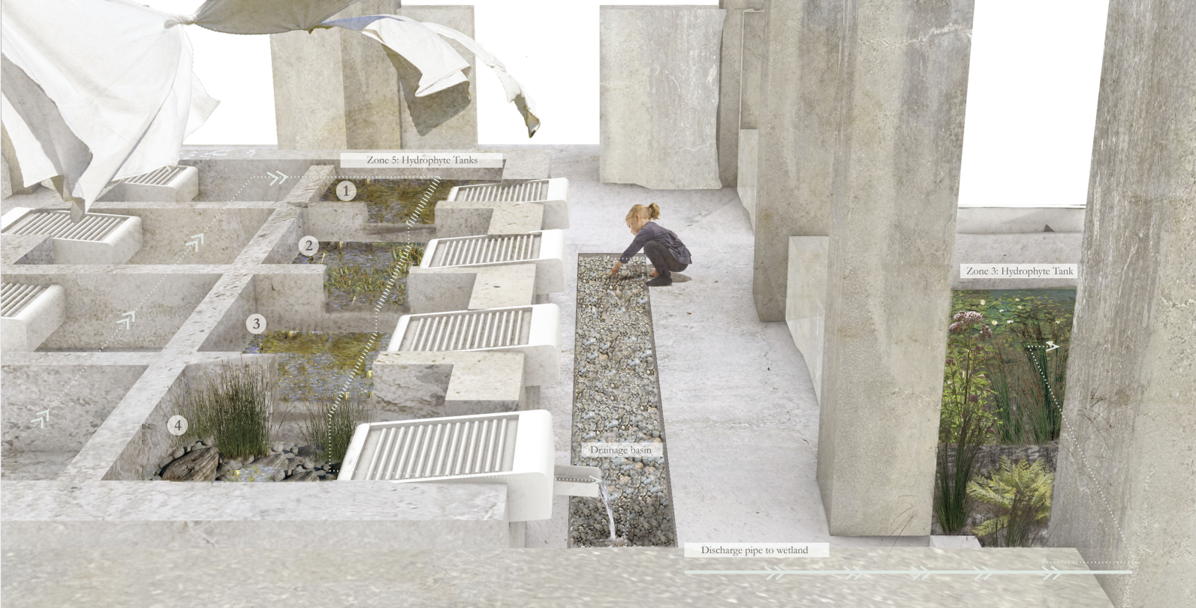 Biofilters and Hot Spot for Fauna, Flora, and People: Re-naturalizing the existing washing tanks into water gardens with native and climate-adaptive plants that provide unique filtration services, as well as food and habitat for pollinating insects, lizards, birds, and bats.