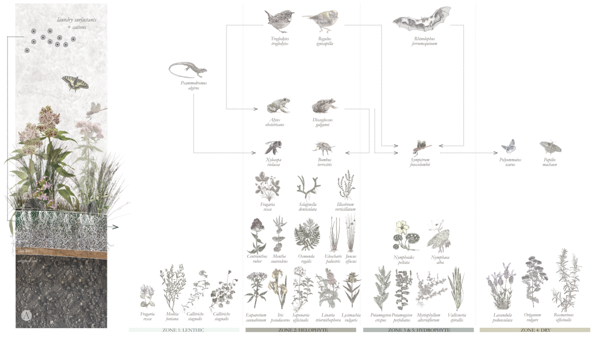 Landscape architects and architects collaborated to transform the water tanks into an accessible and aesthetically pleasing civic space for both humans and non-humans in the village of Cepos. Biologists provided expertise on native plants, soils, and fauna compatible with the existing water tank environments, aiming to establish a new biodiversity hotspot.