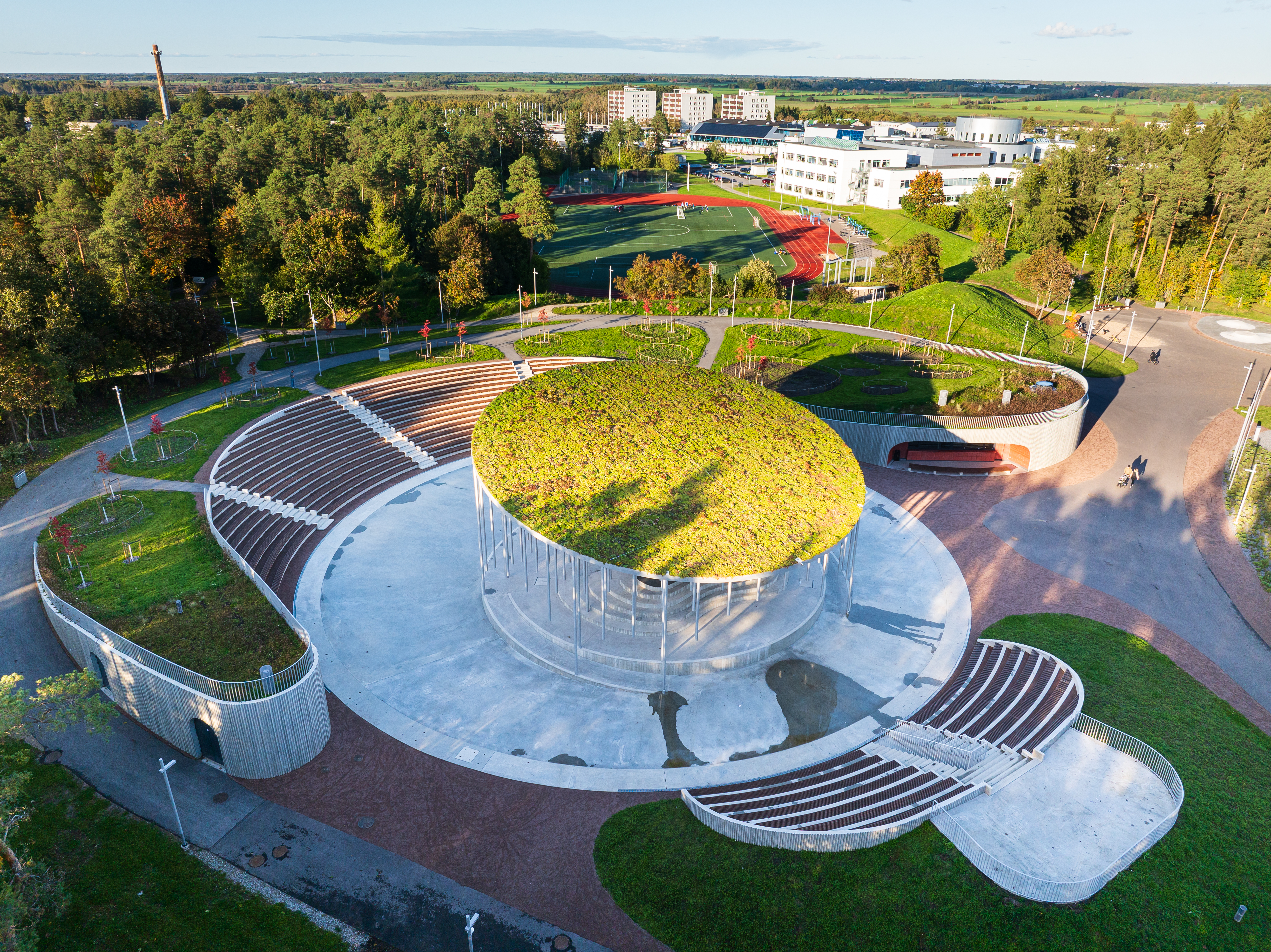 A public landscape architecture competition was held in the second half of 2020 to find the best solution for public space. Song festival grounds now stands as an instantly recognizable work of art built with diligence and attention to detail. Water-permeable innovative paving materials (Ecogrus) are used to lessen the effects of rain during summer events as well as the strain on public rainwater drainage system. Bamboo seating is expected to be peasant to sit on for decades to come. Flowering fields around seating areas have been designed to provide constant flourishing through vegetation period. But several years of weeding and sowing are needed to achieve a long lasting and biodiverse and low maintenance environment.