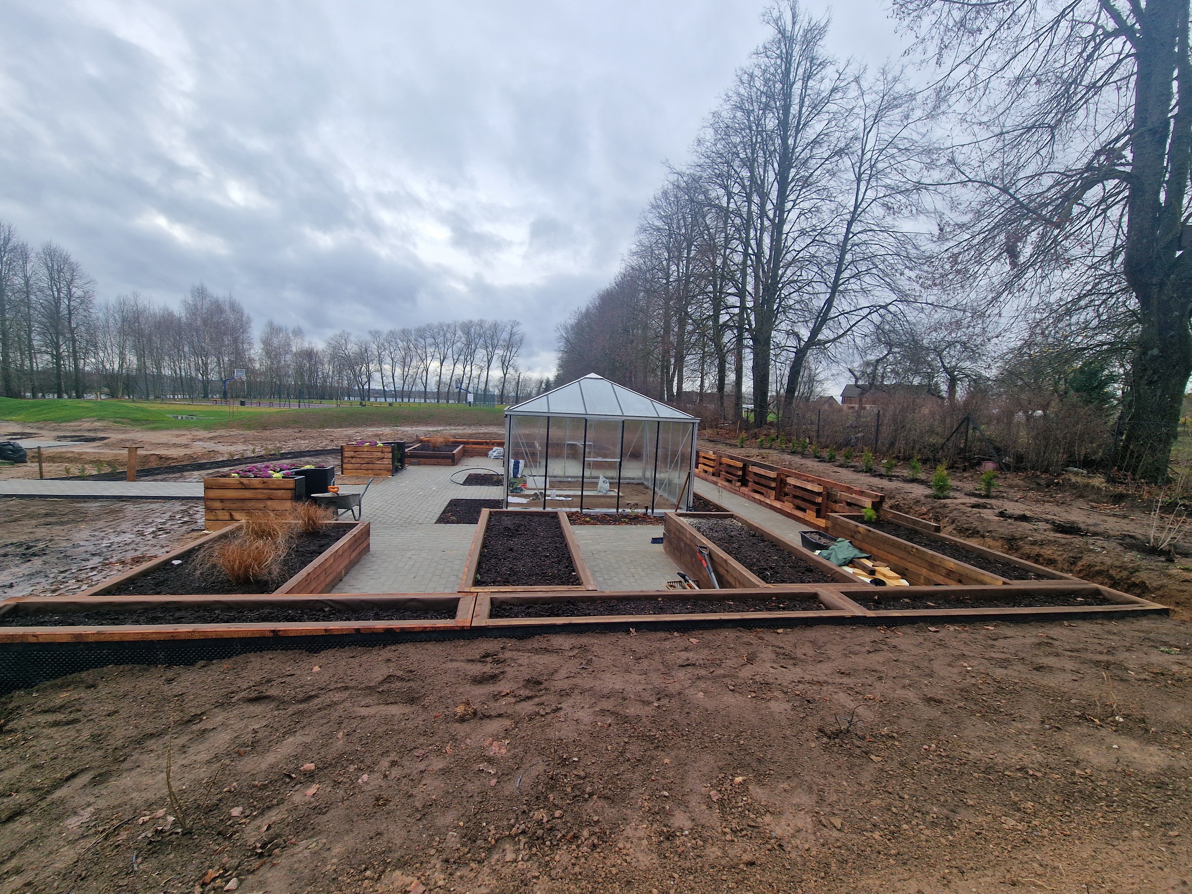 One of the main goals of the project is to ensure inclusion, which encompasses both physical accessibility and social inclusion. The technical design project for the infrastructure is guided by STR 2.03.01:2001 "Buildings and Territories. Requirements for the Needs of Persons with Disabilities" and the principle of universal design. Physical accessibility is ensured by designing both the building and outdoor infrastructure to be accessible to all persons, regardless of their disability. Decisions were made taking into account the needs of both persons with mobility disabilities and other persons who need the services provided in the infrastructure. Building: The premises are designed to be of sufficient size and furniture layout so that persons with wheelchairs can move freely within the premises. Adapted sanitary facilities, elevators and other amenities are installed. Outdoor infrastructure: The outdoor infrastructure is designed to be comfortable and adapted to everyone. An outdoor area with sports equipment adapted for everyone, including persons with disabilities, has been installed. The paths and other spaces are designed to be easily passable and safe for everyone. In addition to physical accessibility, great attention is also paid to social inclusion. The project aims to create an environment where all persons feel respected and valued, have the opportunity to actively participate in community life and receive the necessary assistance. Communication between residents is encouraged in the care home, and various activities are organized in which all residents can participate, regardless of their physical or mental limitations. A relaxation area, a training area adapted for seniors and people with disabilities, and a gardening area with a greenhouse and work tables for people with disabilities have been installed.