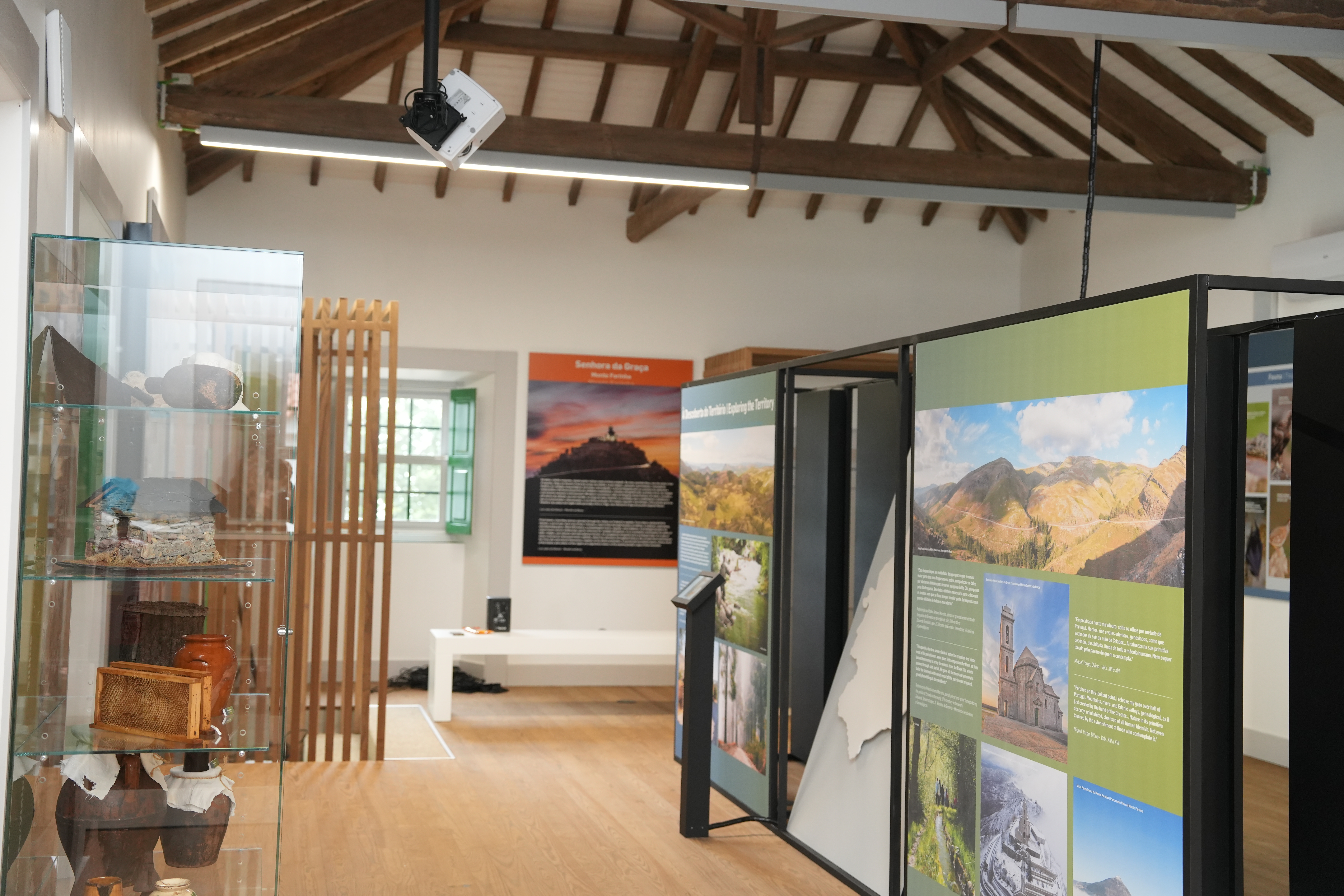 Aesthetically and strategically located in the Interpretive Centre is the Senhora da Graça panel, an iconic element of the area. Those who immerse themselves in the image of the panel are transported to a holistic dimension favoured by the possibility of contemplating it live through the adjoining window. The production of a map of the area with images of the town and mountains, villages, rivers, nature experiences and useful information about the region, allows visitors to get to know and explore the area in an interactive way, simply by selecting and exploring the various themes available. The great benefit of this equipment will be to perpetuate the county's heritage over time and keep it constantly updated.