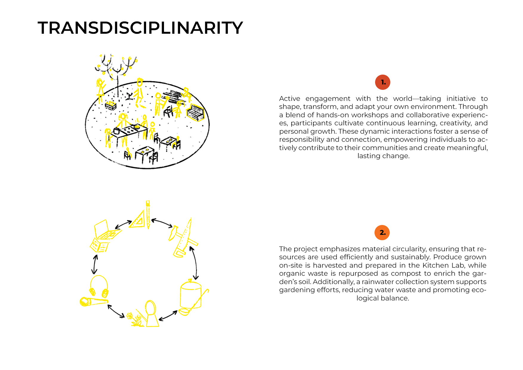The project focuses on material circularity: produce grown on-site is prepared in the Kitchen Lab, while letfovers are used as compost in the garden. Additionally, the project includes the collection of rainwater, which is the used for gardening. It also aims to diversify the ecosystems on-site: using water-absorbing plants and a seed library that ensures and contributes to the variety of plants on the site.