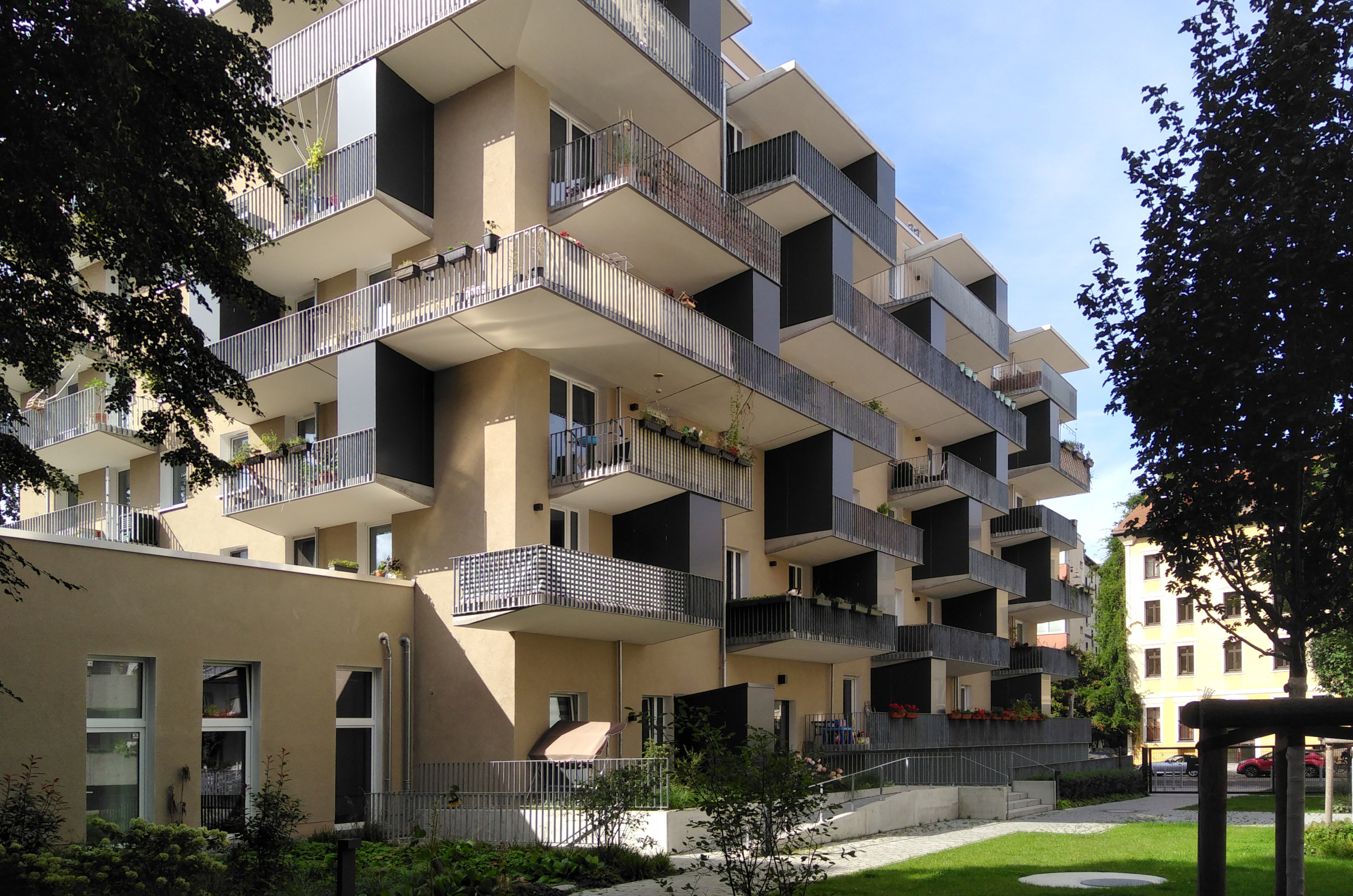 The respectful renewal of the historical settlement complex in combination with the newly built extensions, a variety of socio-cultural activities in the surrounding neighborhood, and the adaptation of contemporary demographic needs generated a new sense of future-oriented lifestyle. The intergenerational exchange between seniors, students, singles, or young families is also an important link and contributes to the revival of community cohesion.