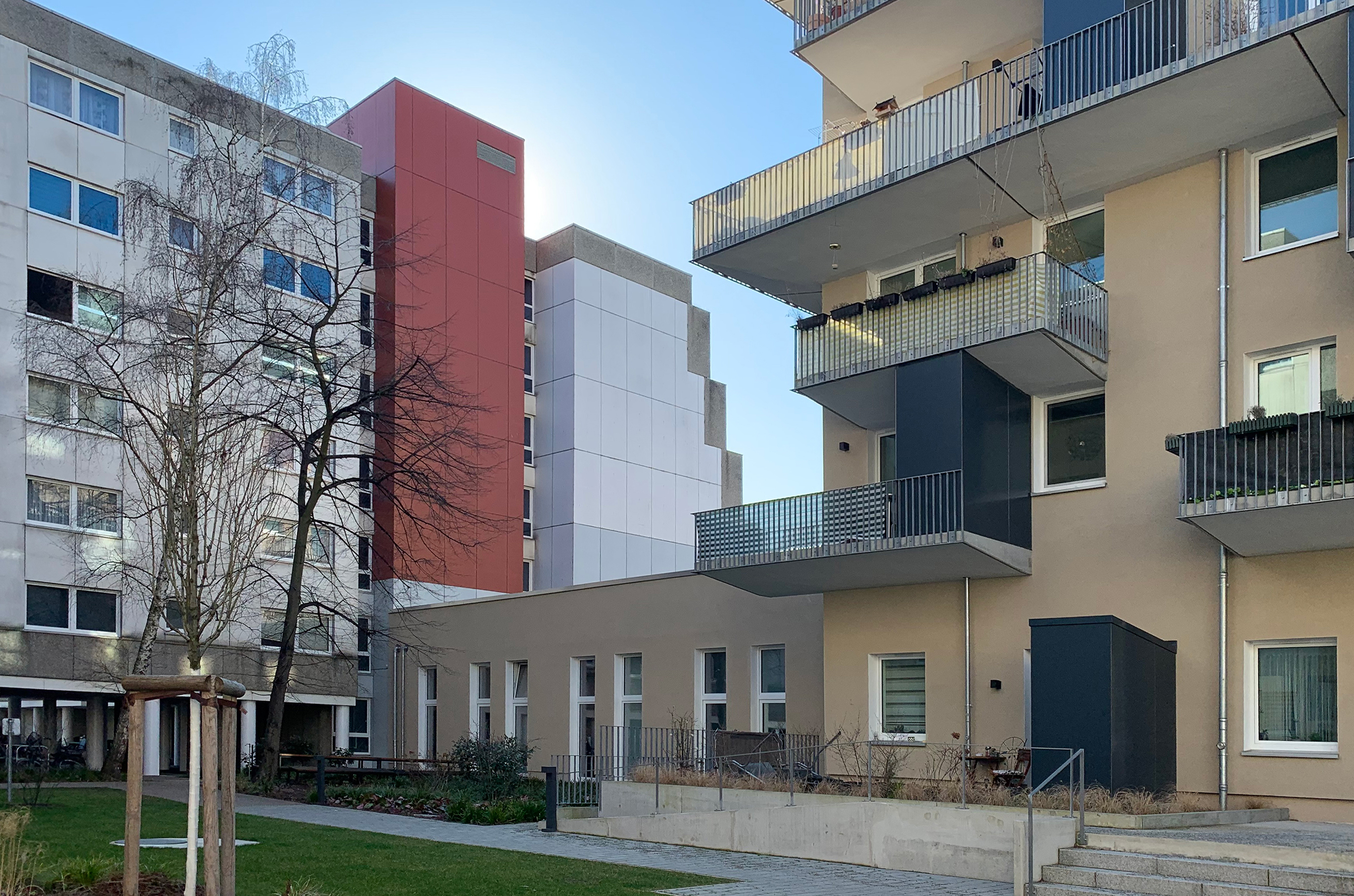 The cooperative project represents a successful approach to combining today’s challenges with intelligent building solutions, energy efficiency, affordable rents, and social and cultural goals. Despite the creation of additional apartments and common areas, the size and quality of the outdoor space were maintained. The new variety of service facilities and a mixture of households guarantees lifelong perspectives, social cohesion, an architectural landmark, and a win-win situation.
