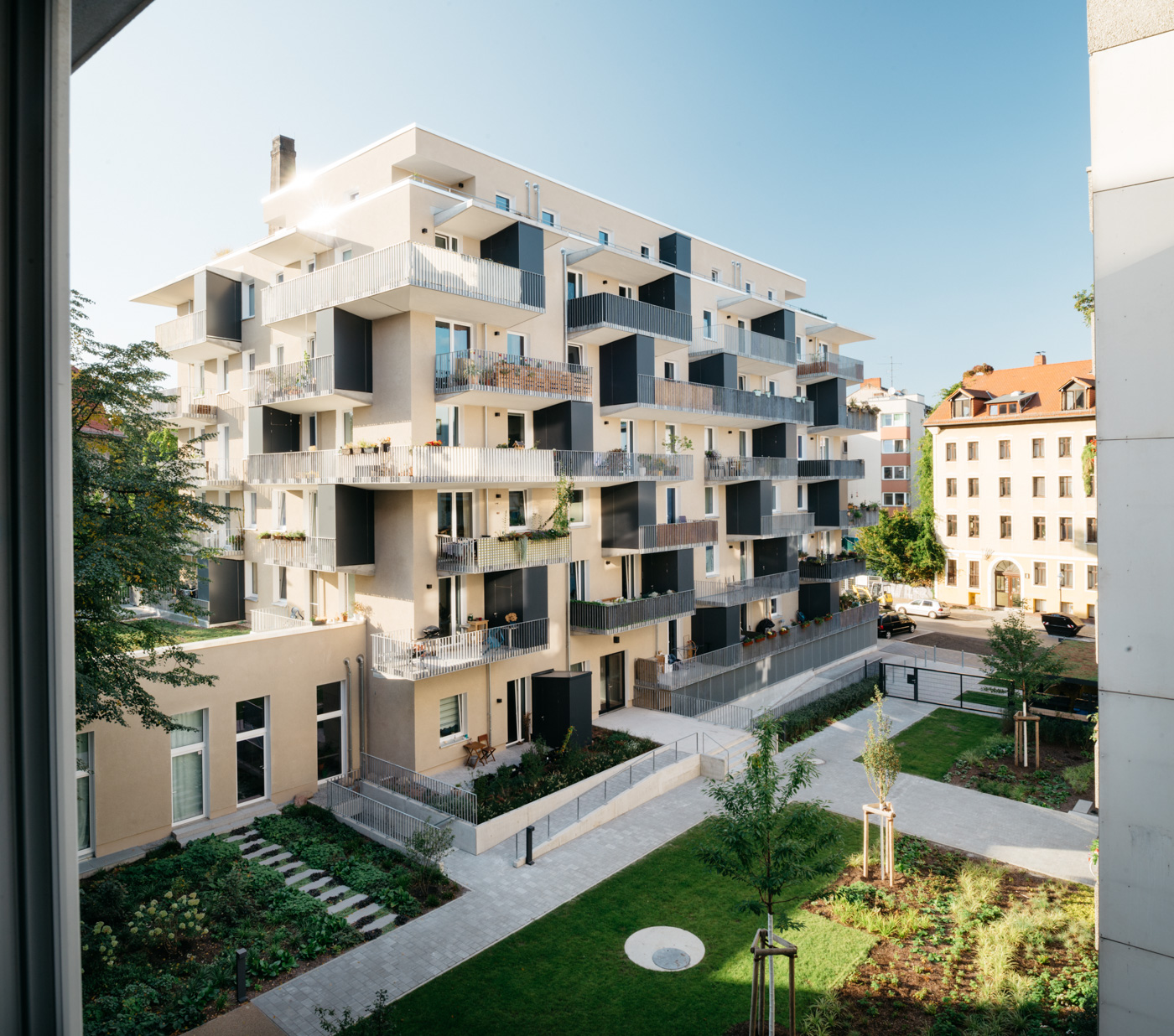COMPACT CONSTRUCTION: A new building on the partly demolished parking garage with 40 dwellings and additional filling-in functions in the previously open spaces at the ground floor level did not require an additional plot of land or soil sealing and maintains the existing courtyard as a “green lung”.